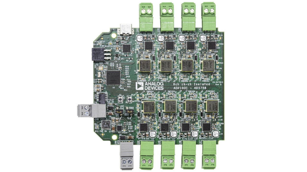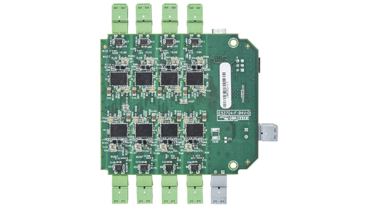 Die achtkanalige Demo-Schaltung von Analog Devices verwendet nur eine Leiterplatte mit sechs Lagen und misst 77 mm × 86 mm (Bild 6).