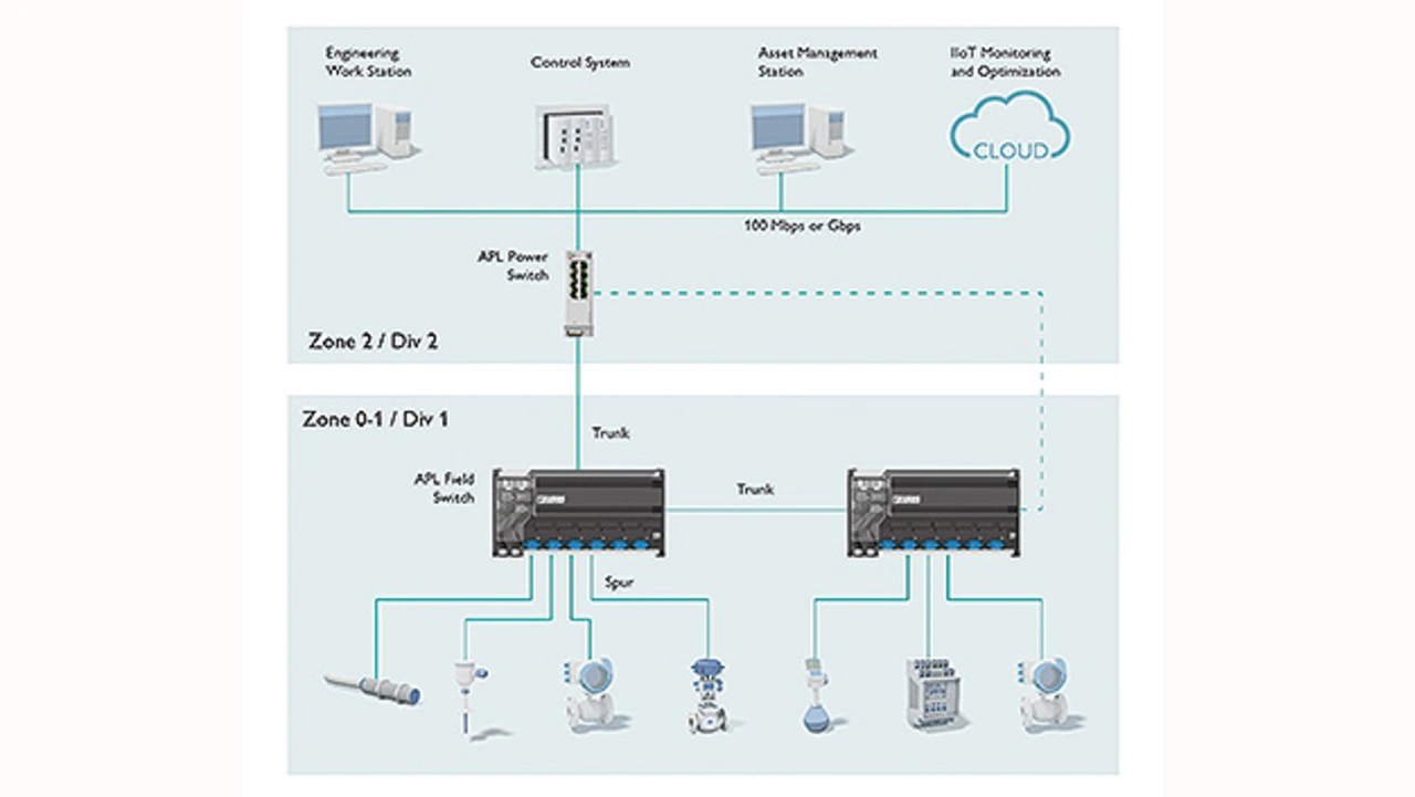 Beim sogenannten Advanced Physical Layer (APL) handelt es sich um eine Erweiterung von SPE in Bezug auf prozesstechnische Rahmenbedingungen. In diesem Umfeld muss die Netzwerkinfrastruktur insbesondere die erhöhten Anforderungen hinsichtlich langer Übertragungsstrecken bei gleichzeitiger Daten- und Energieübertragung für den Einsatz in explosionsgefährdeten Bereichen erfüllen. Zu diesen Zweck werden heute RS-485-basierte Feldbussysteme wie Profibus-PA oder Fieldbus Foundation eingesetzt. Die dabei bewährte Trunk-and-Spur-Struktur wird zukünftig auch bei APL angewendet (Bild 1).