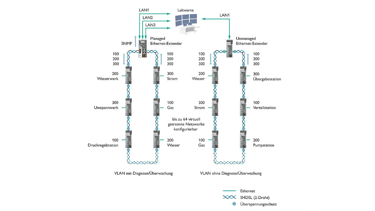 Als Beispiel sei ein Ethernet-Extender genannt, der in einer Gasstation installiert ist und via SHDSL mit weiteren Außenstationen (Gas, Wasser, Strom) in Verbindung steht. Der LAN-Port des Extenders wurde für VLAN 100 konfiguriert. Kommt an diesem LAN-Port ein Standard-IP-Telegramm nach IEEE 802.3 von der Steuerung an, erhält es den Vermerk »VLAN 100« und wird auf SHDSL ausgegeben. Gemäß IEEE 802.1q werden dem Standard-Ethernet-Datenpaket hierbei VLAN-spezifische Informationen hinzugefügt, sodass es sich um vier Byte verlängert. Das IP-Telegramm wird also um ein »VLAN-Tag« ergänzt. Markiert mit »VLAN 100« durchläuft das IP-Telegramm das komplette Kommunikationsnetzwerk so lange, bis es auf ein VLAN-konfiguriertes Ethernet-Gerät trifft, welches das »VLAN-100«-Telegramm verteilen darf.