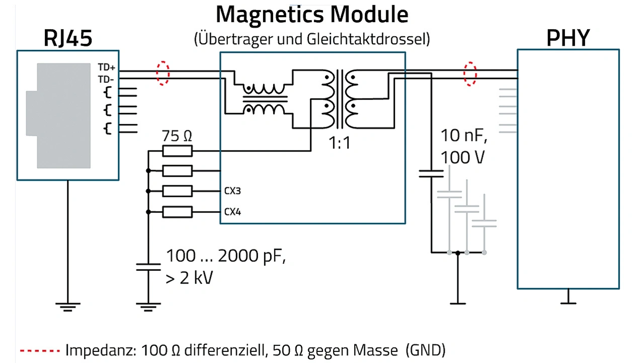 Ankommend von der RJ45-Schnittstelle gelangt das Ethernet-Signal über die Gleichtaktdrossel zu den Übertragern. In Bild 1 ist nur einer von vier Kanälen dargestellt. Der Übertrager besitzt eine Mittelanzapfung, die, signaltechnisch betrachtet, ein Nullpotenzial darstellt. Unsymmetrien wirken sich als Spannung an der Mittelanzapfung aus und werden über die 75-Ω-Widerstände, die gleichspannungsmäßig über den Kondensator entkoppelt sind, gegen Masse abgeschlossen. Der Übertrager weist ein Übersetzungsverhältnis von 1:1 auf. Sekundärseitig gelangt das Ethernet-Signal über die vier Kanäle zum PHY. Auch hier beträgt die Impedanz 100 Ω differenziell, bzw. jeweils 50 Ω gegen Masse (GND). Die Mittelanzapfung des Übertragers ist auf der sekundären Seite über Kondensatoren wechselspannungsmäßig gegen Masse abgeschlossen.