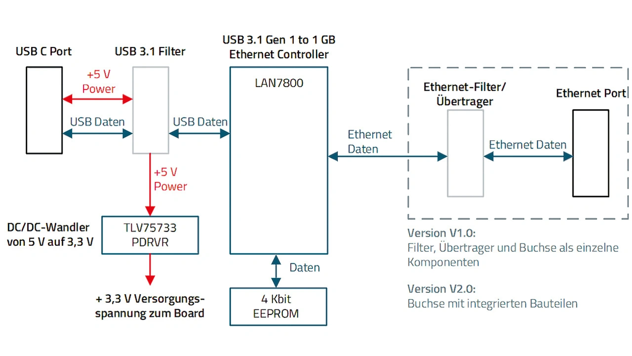 Somit sind für die Beschaltung der Schnittstellen lediglich die signaltechnischen Anpassungen und Entkopplungen zu realisieren. USB-seitig wird mit einem DC/DC-Wandler die für den LAN7800 notwendige 3,3-V-Versorgungsspannung erzeugt. Der LAN7800 benötigt zur Speicherung der Firmware ein zusätzliches 4-kbit-EEPROM.
