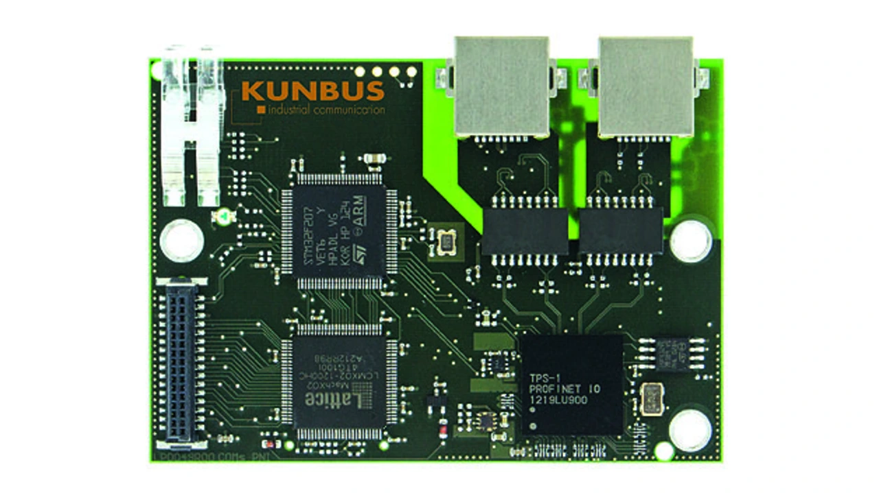Das Profinet-Modul Kunbus-COM (Bild) ist aus der Weiterentwicklung der Kunbus-IC-Familie entstanden. Das Modul enthält eine zertifizierte und komplette Kommunikationsschnittstelle mit allen notwendigen Komponenten. Die Anbindung der Applikation geschieht mittels eines SMC-Steckers mit 32 Pins. Die Profinet-Optionsplatine enthält ebenfalls alle Steckverbinder für die Busanbindung, aber auch die Übertrager, Bustreiber, Mikrokontroller sowie Speicher. Die Verbindung der Profinet-Module mit der Applikation (Sensor oder Aktor) wird durch einfaches Aufstecken auf die Steuerungsplatine oder mit Hilfe eines Kabels durchgeführt. Durch das einheitliche Pin-out aller COM-Module können diese einfach gegen andere Varianten (z.B. EtherCAT, Ethernet/IP) ausgetauscht werden. Die Anbindung der Applikation geschieht dabei über folgende Schnittstellen: