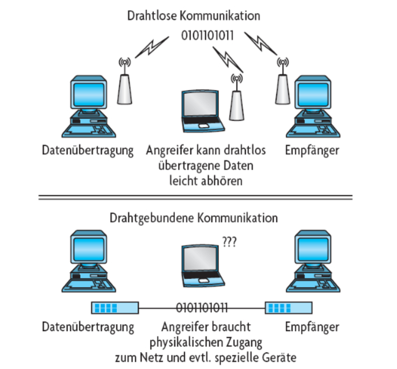 Ein funkgestütztes Netzwerk sendet ständig Daten, und zwar an jeden, der über einen entsprechenden Empfänger verfügt (Bild 1). In einem drahtgebundenen Netzwerk gestaltet sich der Zugang zu den Daten wesentlich schwieriger. Sicher könnte ein Angreifer einen induktiven Sensor benutzen, um die Daten mitzulesen, man könnte dann aber immer noch einen Faradayschen Käfig um das Kabel legen und dieses einbetonieren. Bei Funksystemen gibt es solche Optionen nicht.