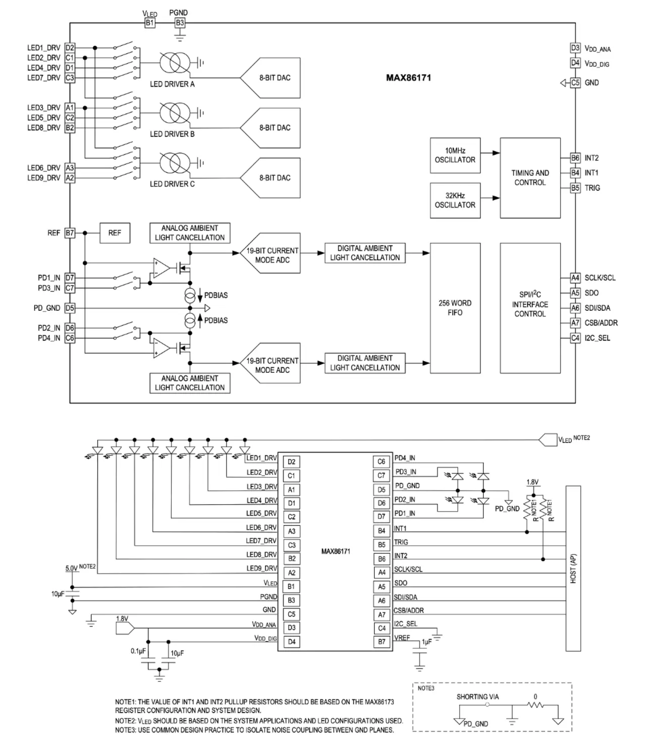Fortgeschrittene LED-plus-Photosensor-Systeme bieten zusätzliche Leistung und Möglichkeiten. ICs wie der MAX86171 (Bild 2, oben), ein optisches Datenerfassungssystem mit extrem niedrigem Stromverbrauch und Sende- und Empfangskanälen, sind auf FLD-Anwendungen zugeschnitten. Dank der hohen Integrationsdichte werden nur wenige diskrete Komponenten benötigt (Bild 2, unten).