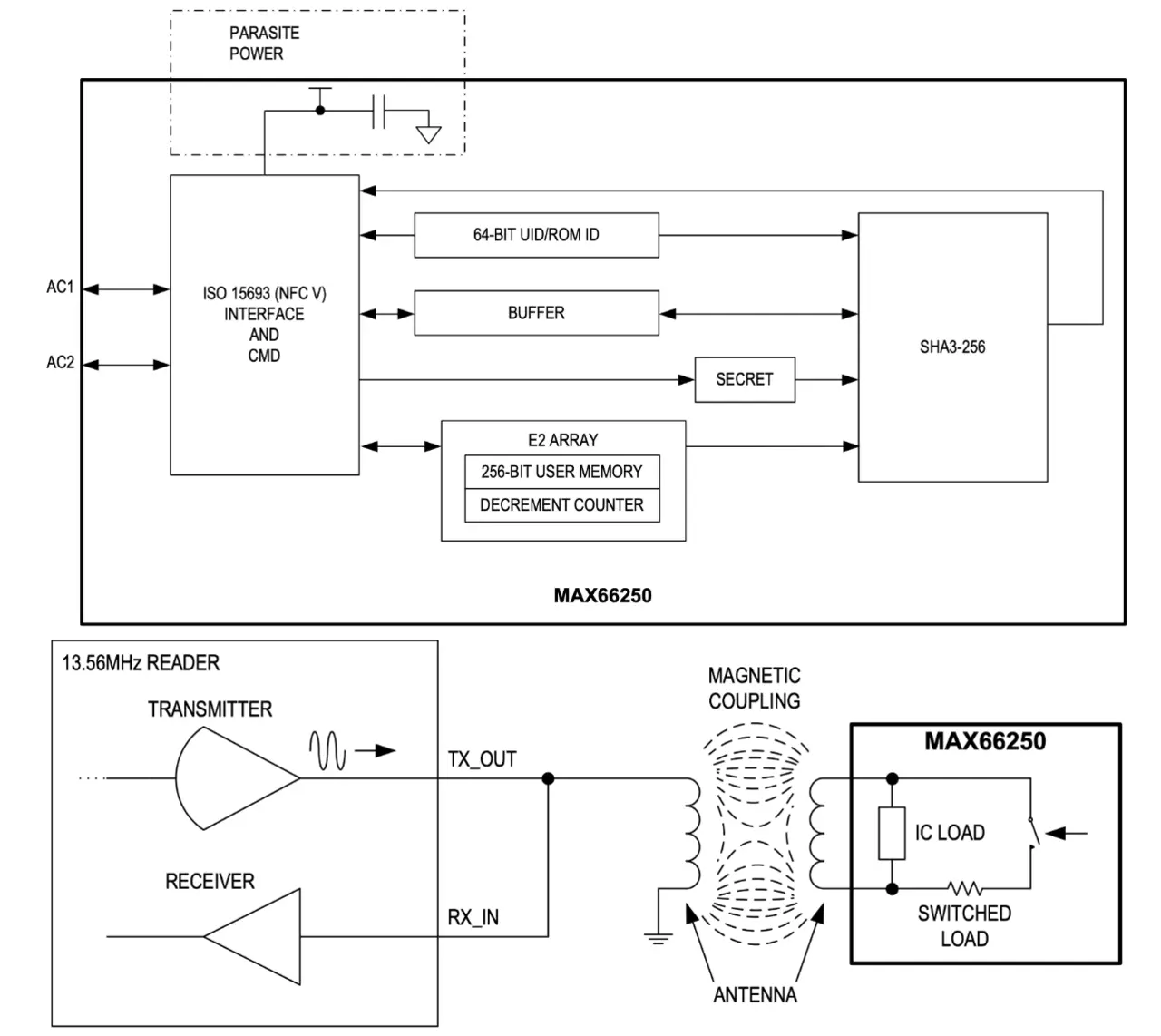 Der sichere Authentifikator kombiniert die FIPS-202-konforme SHA-3-Challenge-Response-Authentifizierung (SHA: Secure Hash Algorithm) mit einem gesicherten EEPROM. Die Komponente bietet eine Reihe kryptographischer Basiswerkzeuge, die aus integrierten Blöcken abgeleitet werden, einschließlich asymmetrischer Hardware-Engine, echtem Zufallszahlengenerator (TRNG), 3 KB gesichertem EEPROM, ausschließlich dekrementierendem Zähler und eindeutiger 64-Bit-ROM-Kennnummer (ROM-ID). Die einzigartige ROM-ID dient als grundlegender Eingangsparameter für kryptographische Operationen und als eine elektronische Seriennummer innerhalb der Anwendung. Die Komponente kommuniziert über eine HF-Schnittstelle, die der ISO/IEC 15693 entspricht. Für Kabel-Verbindungen bietet der sichere 1-Wire-SHA-3-Authentifikator DS28E16Q+U die gleichen kryptografischen Tools wie der MAX66250, einschließlich einer eindeutigen ROM-ID.