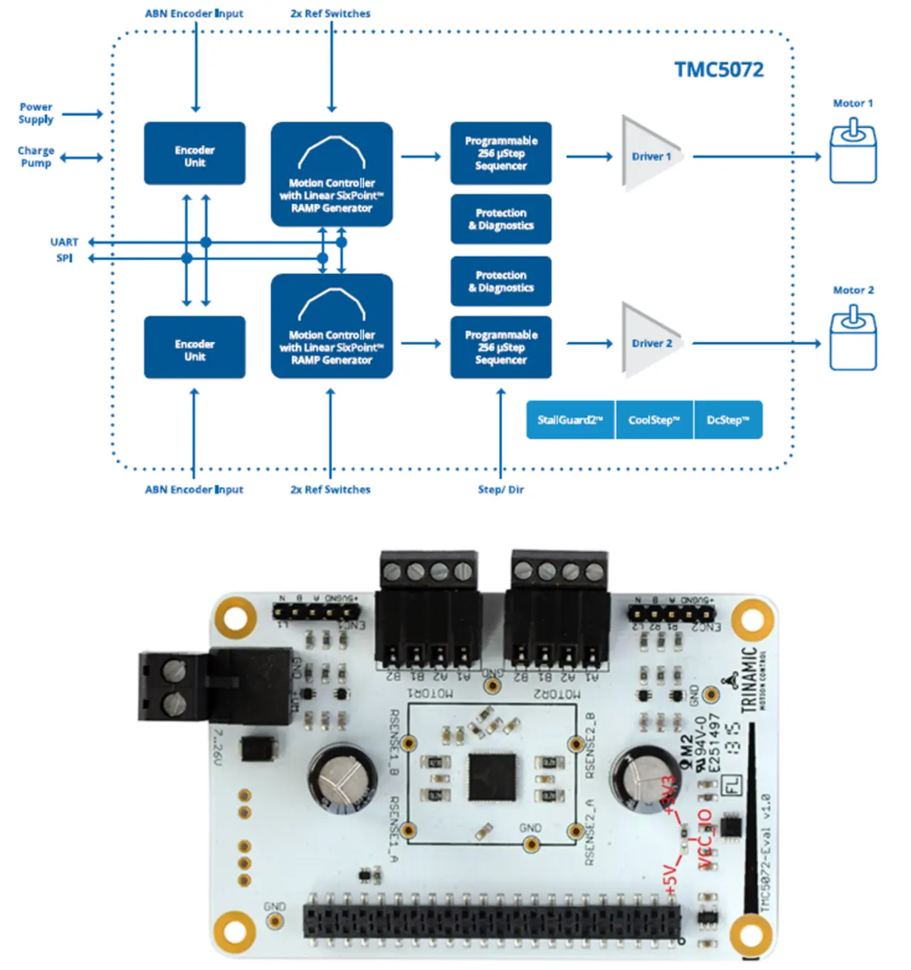 Der TMC5072 kombiniert flexible Rampengeneratoren für die automatische Zielpositionierung und kann geräuschlos, hocheffizient und mit einem hohen Motordrehmoment betrieben werden. Der 7 Millimeter × 7 Millimeter große IC bietet darüber hinaus zusätzliche Funktionen. Dazu gehören StealthChop für besonders leisen Betrieb und gleichmäßige Bewegung, ein hochdynamischer SpreadCycle-Chopper für die Motorsteuerung, DCStep für lastabhängige Drehzahlregelung, eine sehr präzise sensorlose Motorlasterkennung StallGuard2 und eine CoolStep-Stromregelung für Energieeinsparungen von bis zu 75 Prozent.