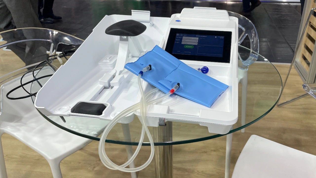 Als »fertiges« Medizingerät stellte Teoresi an seinem Stand in Halle 12 der Medica »Vencom« vor, ein Akronym für »Venous Congestion Meter«. Patienten mit z.B. Herzinsuffizienz oder Hüftgelenksdysfunktion können ihren Venendruck und eventuelle Stauungen damit auch außerhalb von Kliniken und Arztpraxen überwachen und messen. Mit sehr einfacher Handhabung werden dazu zwei pneumatische Manschetten am Arm angelegt. Eine Verschlussmanschette befindet sich am Oberarm und ein empfindliches Element am Unterarm des Patienten. Diese Art der Messung des Venedrucks ist neuartig und verspricht eine kontinuierlichere Überwachung von Risikopatienten daheim und eine Zeitersparnis für Ärzte und das Gesundheitssystem. Denn der bisherige Goldstandard für diese Untersuchung basiert auf einem Katheter, der dem Patienten ambulant in eine große Vene eingeführt wird. Im Gegensatz dazu kann dieses Gerät die Messung des Venendrucks auf nicht-invasive Weise durchführen. Medizingeräte-Hersteller können dazu Alarm-Modi oder Connectivity-Funktionen zur telemedizinischen Behandlung eindesignen.