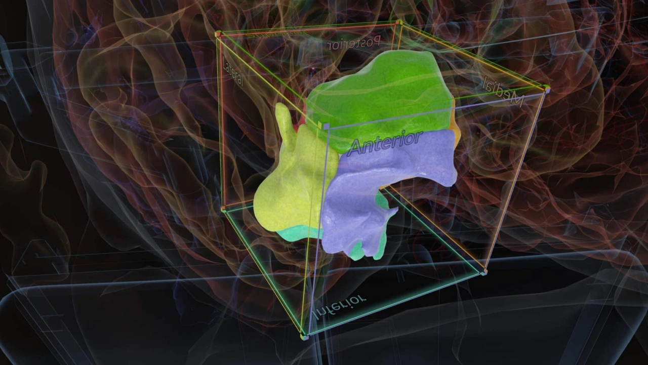Mit einer segmentierten Ansicht des Gehirns eines Patienten kann Atlas Pathfinder sein 3D-Gehirnmodell so anpassen, dass es sich an die spezifische Anatomie des Patienten anpasst und erfasst, wie der Tumor die normale Struktur des Gehirngewebes verformt.