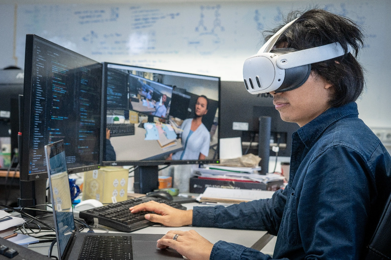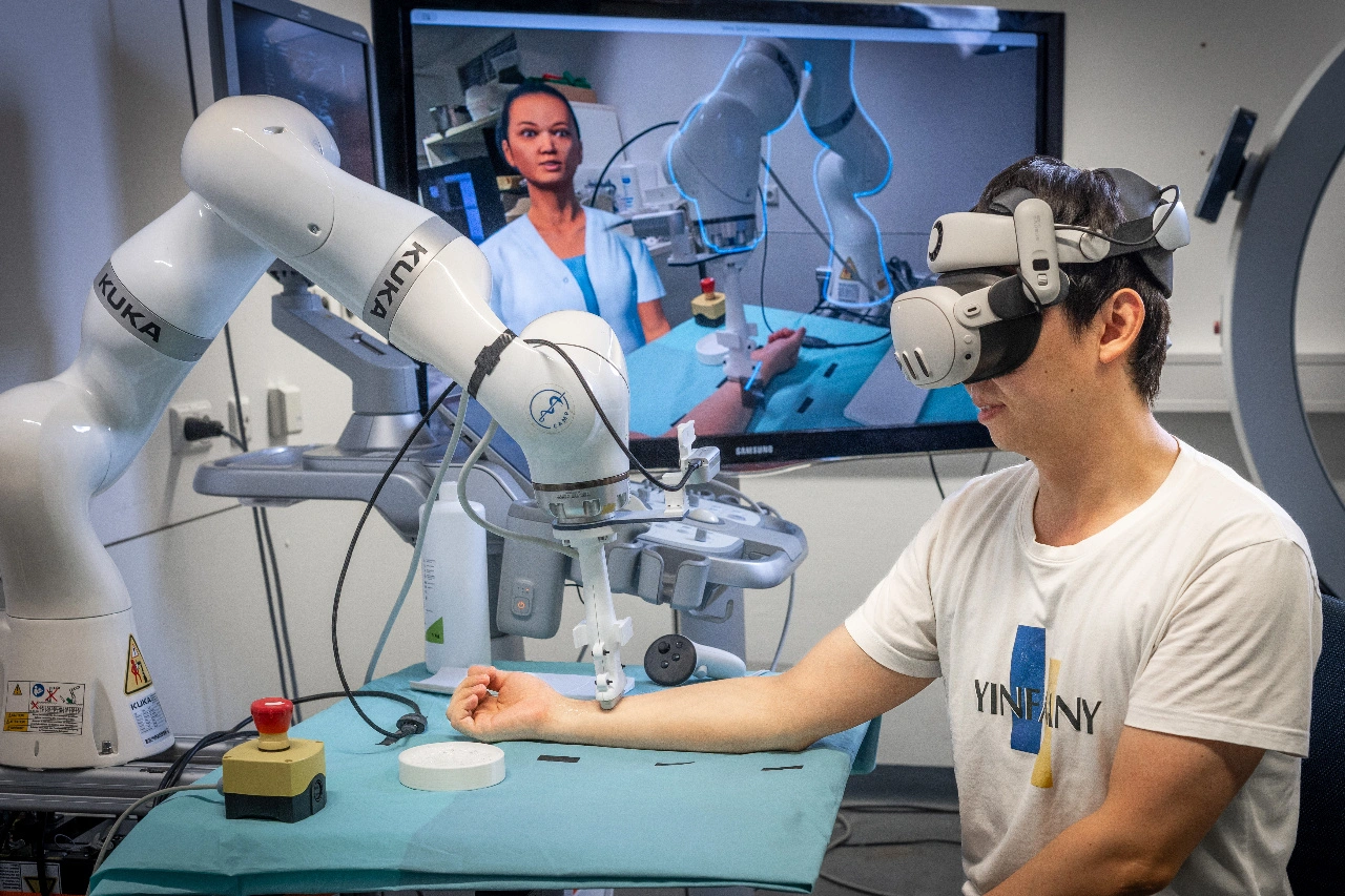 Ein großer Bildschirm, eine Virtual-Reality-Brille, ein Roboterarm mit Ultraschallkopf und ein leistungsfähiger Rechner: Das ist die Ausstattung, die TUM-Forscher Tianyu Song aus dem Lehrstuhl für Informatikanwendungen in der Medizin für die autonome Untersuchung der Aorta, der Halsschlagader oder der Arterie im Unterarm benötigt.