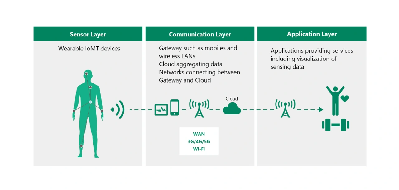 Vom IoMT-Gerät werden die Messdaten über Wi-Fi oder Bluetooth an Smartphones oder Gateways gesendet. Einige IoMT-Geräte verfügen über integrierte SIM-Karten und lassen sich direkt mit öffentlichen Netzen verbinden. Die erfassten Daten wie Atemfrequenz, Körpertemperatur, Pulsfrequenz und Blutdruck sind grundlegende Informationen, die als Vitalzeichen bezeichnet werden, zu denen manchmal auch die Sauerstoffsättigung des Blutes (SpO2) inbegriffen.