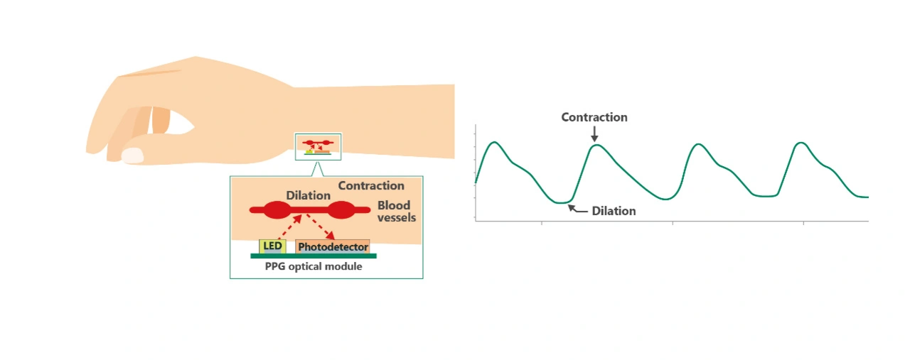 Einer der großen Vorteile der Erfassung biometrischer Daten durch externe Gesundheitsgeräte besteht darin, dass sie minimalinvasiv ist und keine Blutentnahme oder Implantate im Körper erfordert - doch auch invasive Medizingeräte wie aktive Implantate können an das IoMT und Smartphones angebunden werden. Eine grundlegende Technologie für klassische Wearables ist die Photoplethysmographie (PPG), die Veränderungen des Blutgefäßvolumens optisch erfasst. Eine LED auf der Rückseite einer Smartwatch sendet Licht (hauptsächlich grünes) an die Blutgefäße im Handgelenk, wobei das reflektierte Licht von einem Fotodetektor empfangen wird. Die Smartwatch nutzt die Signalverarbeitung, um regelmäßige Schwankungen aus den verschiedenen Rauschkomponenten zu extrahieren und die Pulsfrequenz zu ermitteln. Wenn grüne und rote LEDs zusammen verwendet werden, lässt sich die transkutane arterielle Blutsauerstoffsättigung (SpO2) aus dem Grad der Hämoglobinbindung abschätzen.