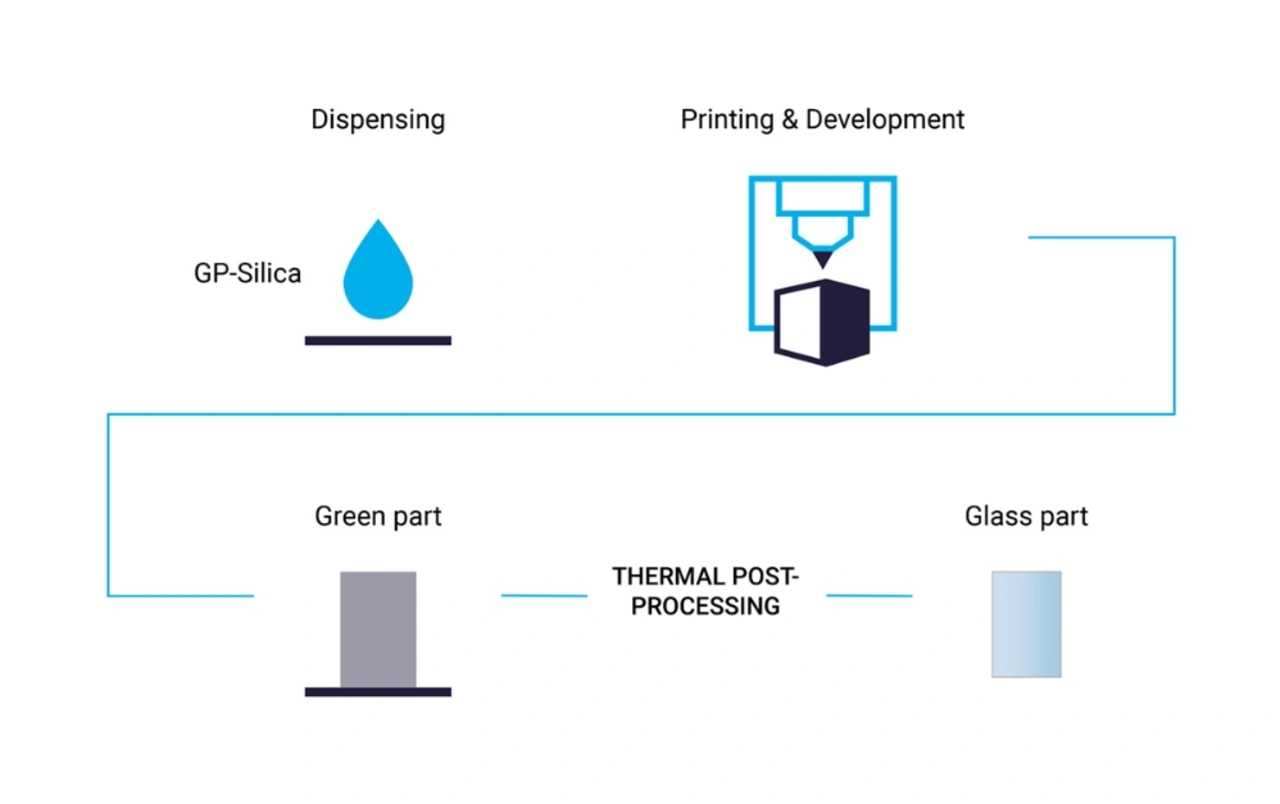 Der neue Fotolack ist ein neuartiges Material und speziell auf die 3D-Mikrofabrikation mit Nanoscribe 3D-Druckern abgestimmt. Wie bei der Glasherstellung üblich, sind thermische Behandlungen notwendig: Der Fabrikationsprozess beginnt mit dem bekannten hochpräzisen 3D-Druckverfahren von Mikrostrukturen.