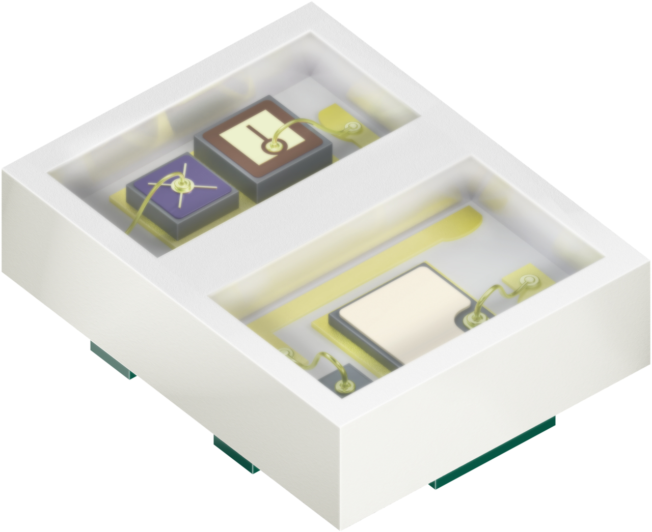 UV bei 383 Nanometern fügt eine dritte, grundlegend andere Messdimension hinzu: Nicht Hämodynamik, sondern Gewebefluoreszenz. AGEs werden im UVA-Bereich angeregt und emittieren ihr Fluoreszenzsignal bei deutlich längeren Wellenlängen – genau im Erfassungsbereich der ohnehin vorhandenen Fotodiode. Das macht den SFH 7019 zu einer echten Systemlösung: Ein einziger Multi-Emitter deckt Herzfrequenz und AGE-Messung ab, ohne separate Komponenten für jeden Parameter.