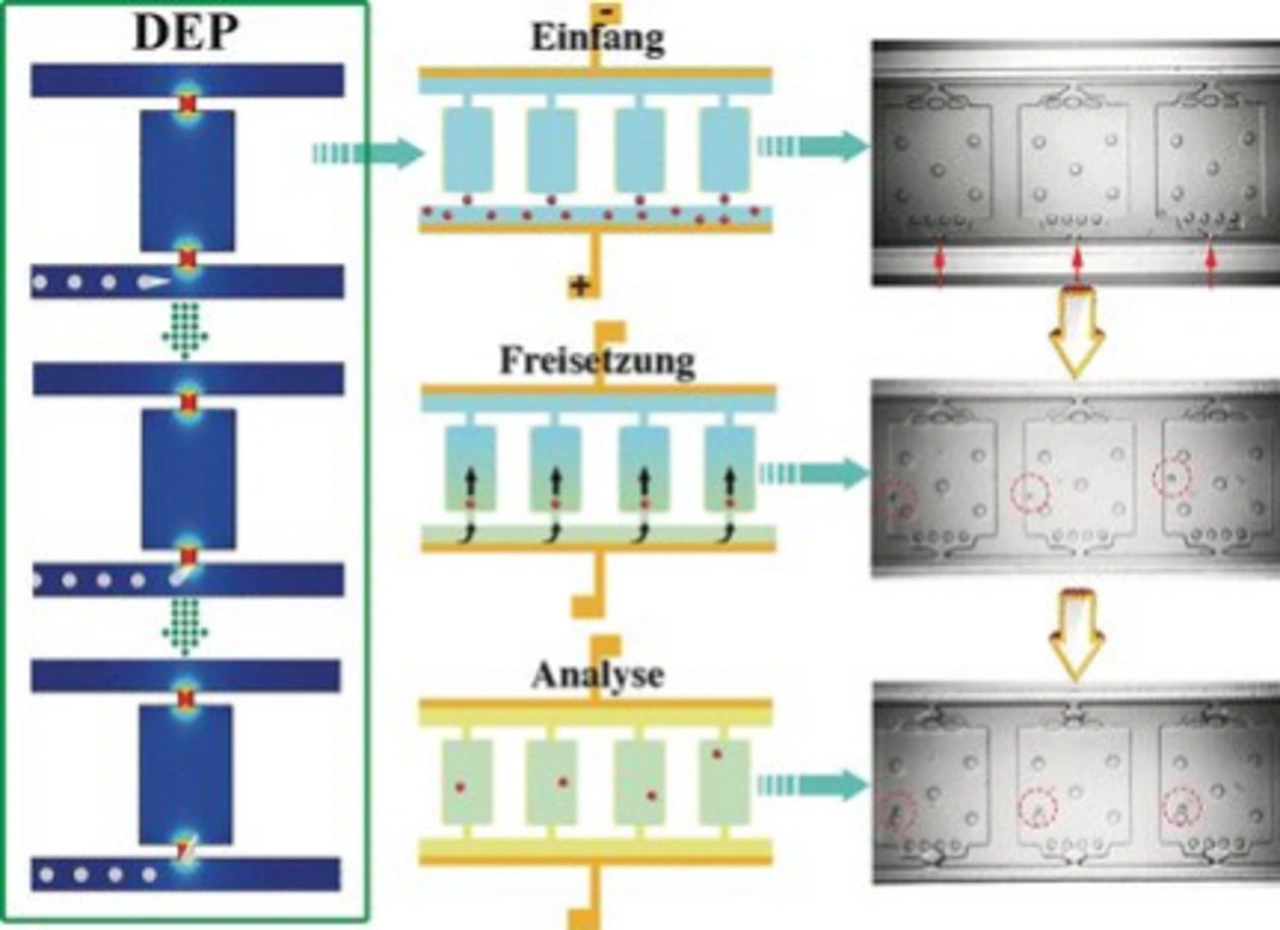 An den schmalen Eingängen zu den Kammern treten lokale Maxima des elektrischen Felds auf. Zellen, die hinein geraten, werden »gefangen«. Da die Öffnungen etwa so groß sind wie die Zellen, wird immer nur eine einzelne Zelle pro Kammereingang festgehalten. Durch Abstellen des Wechselstroms und Erhöhen der Fließgeschwindigkeit durch Injektion der für die spätere Analytik benötigten Reagenzien werden die Zellen in die Kammern gespült. Anschließend eingeleitetes Öl verschließt die Kammern. Die Zellen werden aufgelöst, die freigesetzten Nukleinsäuren vervielfältigt und können zum Beispiel über ein Marker-Gen als Leukämie-Zellen identifiziert werden.