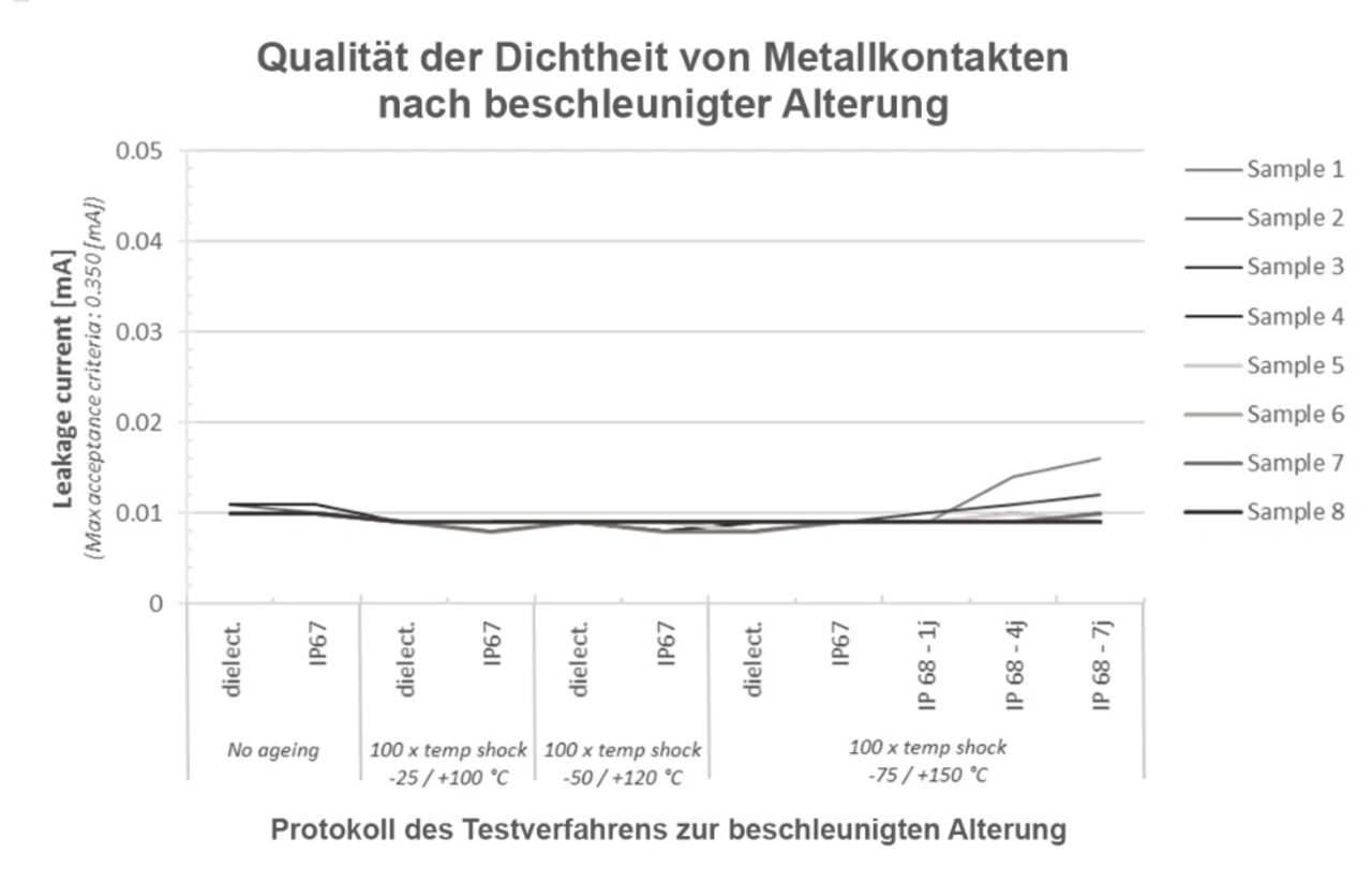 Aufgeführt ist ein Beispiel (Bild oben) für eine Lecktestkampagne, durchgeführt an elektronischen Bauteilen mit einem Messingkontakt, der mit einer einige μm dicken Goldschicht beschichtet ist. Ein dielektrischer Test bei 1500 V, dem ein 30-minütiges beziehungsweise 7-tägiges Eintauchen (IP 67 bzw. IP 68) in Flüssigkeit sowie mehrere hundert Temperaturschockzyklen an der Luft von maximal -75° bis +150°C vorausgingen (Bild 1), zeigt die Qualität der Dichtheit vor und nach der beschleunigten Alterung durch die Messung des Leckstroms.