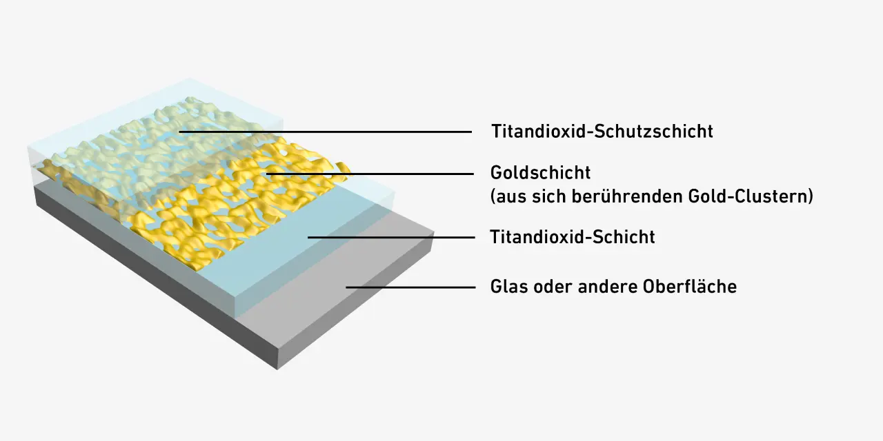 Gold ist zwar teuer. Allerdings wird davon so wenig benötigt, dass die Materialkosten trotzdem tief sind, wie die Forschenden betonen. Die Beschichtung ist nach dem Sandwich-Prinzip aufgebaut. Kleinste und extrem dünne Cluster aus Gold befinden sich zwischen zwei Schichten aus Titandioxid, einem elektrisch isolierenden Material. Diese beiden Schichten erhöhen aufgrund ihrer Lichtbrechungseigenschaften die Wirksamkeit der Wärmegewinnung. Ausserdem dient die obere Titandioxid-Schicht wie ein Lack dem Schutz der Goldschicht vor Abrieb. Die ganze Sandwichbeschichtung ist bloss zehn Nanometer dünn. Zum Vergleich: Blattgold ist etwa zwölfmal dicker.