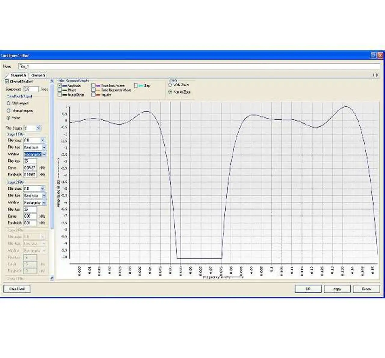 Bei der Übertragungsfunktion des typischen EKG-Systems in Bild 5 liegt die Abtastrate bei 500 Samples/s. Mithilfe eines zweistufigen Filters 35. Ordnung wird eine Nullstelle bei 60 Hz erzeugt, dabei liegt die Signalbandbreite zwischen 0,05 Hz und 150 Hz. Beide Filterstufen weisen 35 Stützstellen auf. Der Filterblock, in dem diese Funktion implementiert wird, verfügt über zwei je maximal vierstufige Filterkanäle. So lassen sich komplexe Filter realisieren, ohne die Filterkoeffizienten manuell berechnen zu müssen. Auch kann das Softwaretool die verschiedenen Parameter wie beispielsweise Phasengang, Impulsantwort oder Sprungantwort grafisch darstellen. Mithilfe anwendungsspezifischer Filterblöcke lassen sich auf bestimmte Anwendungen abgestimmte Filter schnell entwickeln.
