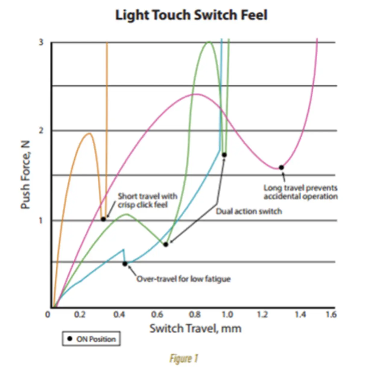 Eine wichtige Rolle im Bereich Bedienelemente spielt die Haptik (positive Click Feeling), die sich ganz nach Kundenwunsch gestalten lässt. Beim haptischen Erleben für Tastschalter sollten Entwickler zu allererst ihr Augenmerk auf die Betätigungskraft legen, die auf diesen wirken soll. Jeder Tastschalter besitzt individuelle Charakteristika, die sich unter anderem durch die Klick-Ratio ausdrücken lassen (Bild 1). Sie beschreibt den spürbaren Widerstand, der bei der Anwendung wirkt. Je höher dieser ist, desto knackiger und dynamischer fühlt sich der Taster an. Hochwertige Taster garantieren in der Regel – abhängig von der Druckkraft – eine Lebensdauer von 100.000 bis eine Millionen Schaltzyklen.