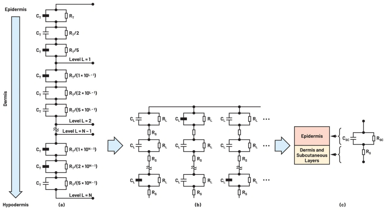 Die menschliche Haut besteht aus drei Hauptschichten: Jede Schicht hat ein äquivalentes elektrisches Modell, das die spezifischen Veränderungen von einer Schicht zur anderen widerspiegelt. Die Modellierung der menschlichen Haut ist komplex, da sie sowohl zwischen verschiedenen Personen als auch bei derselben Person im Laufe der Zeit stark variiert (Alter, Hydratation, Jahreszeit). Es wurden verschiedene Modelle für die Hautimpedanz vorgeschlagen. Die drei bekanntesten Modelle sind die Modelle von Montague, Tregear und Lykken (Bild 3). Das Drei-Elemente-Modell von Montague ist am weitesten verbreitet, da es einfach, intuitiv und leicht zu simulieren ist. Es ermöglicht eine einfache Simulation, ist intuitiv verständlich und erlaubt die Analyse allgemeiner Parameter (Bild 4).