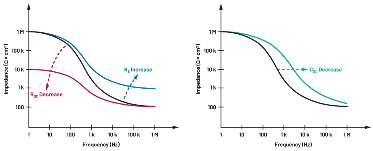 | RSC = 104 ÷ 106 Ω cm2, RS = 100 ÷ 200 Ω cm2 und CSC = 1 ÷ 50 nF/cm2 |
