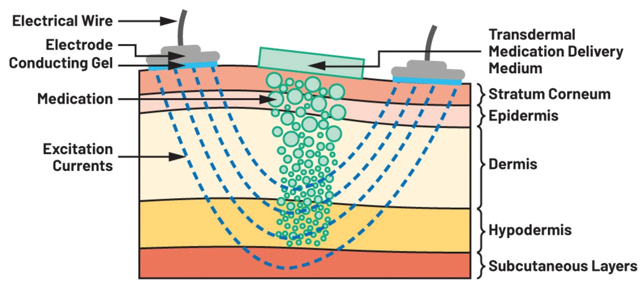 Die Hautpermeation bei der transdermalen Medikamentenverabreichung wird mittels verschiedener physikalischer Prinzipien wie chemische Verstärkung, Diffusion, Absorption, thermische Energie, Ultraschall, Elektrophorese, Iontophorese und Hochfrequenzenergie ermöglicht. Bei der Sonophorese wird Ultraschall verwendet, um topische Behandlungen von der Hornschicht zur Epidermis und Dermis zu transportieren. Iontophorese und Elektroporation machen die Haut durch gepulste elektrische Felder durchlässig, indem sie Poren in den Zellmembranen öffnen. Die Verfahren ermöglichen die Verabreichung von Arzneimitteln, ohne das biologische Gewebe zu beeinträchtigen.