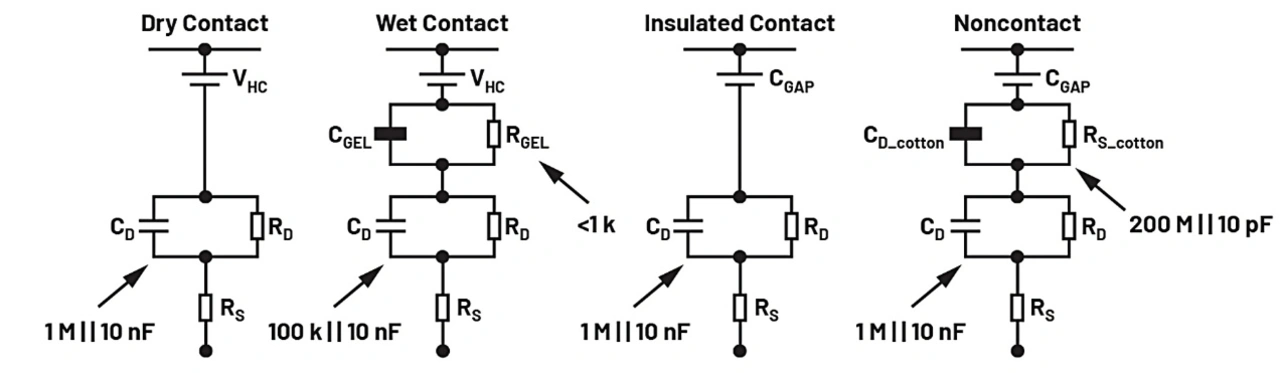 Für andere Elektrodentypen sehen die elektrischen Modelle anders aus. Zum Beispiel benötigen Nasselektroden eine zusätzliche parallele RC-Zelle, um die Leitfähigkeit/Impedanz des Gels darzustellen. Dieser Parameter kann kritisch sein, da er dazu neigt, die Haut des Patienten allmählich zu durchdringen und somit im Laufe der Zeit zu einer allmählichen Abnahme der Impedanz und einer Drift in der Messung führt. Bei isolierten Elektroden (für reine Wechselstrommessungen) wird das Halbzellenpotenzial durch eine Kapazität ersetzt, die die kapazitive Lücke (Cgap) zwischen der Elektrode und der Haut modelliert. Eine Variante davon sind kontaktlose Elektroden, bei denen eine zusätzliche Baumwollschicht auf der Elektrodenoberfläche verwendet wird. Diese kann als eine zusätzliche parallele RC-Zelle betrachtet werden (Bild 7).