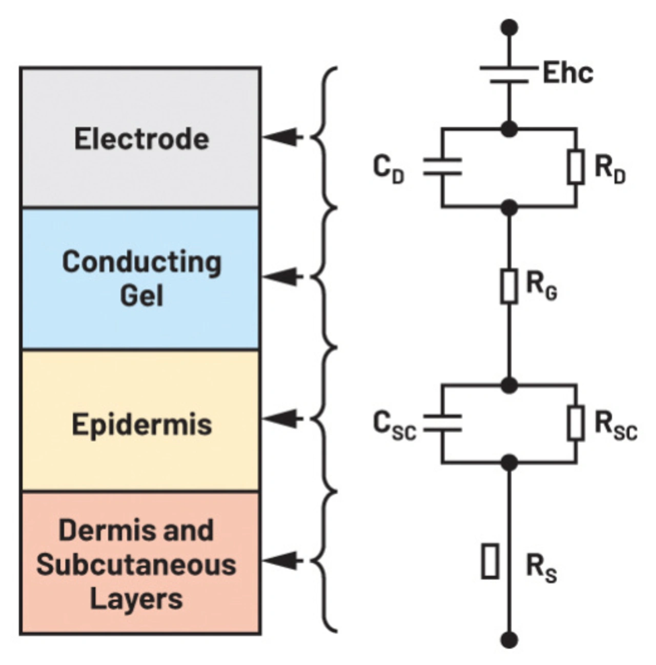 Die Leistung der Elektrode wird durch ein zusätzliches unerwünschtes Phänomen verringert. Um dieses Problem zu lösen, ist es notwendig, ein geeignetes elektrisches Modell für die Elektroden zu definieren (Bild 6). Eine Trockenelektrode kann als ein Stromkreis mit drei in Reihe geschalteten Elementen betrachtet werden: eine Gleichstromquelle, die das Halbzellenpotenzial (EHC) nachbildet, eine RC-Parallelzelle (Rd||Cd), die den Kontakt zwischen dem Metall und dem Nichtmetall (also dem menschlichen Körper) modelliert, und einen Widerstand Rs, der den Widerstand des Metalls der Elektrode darstellt.