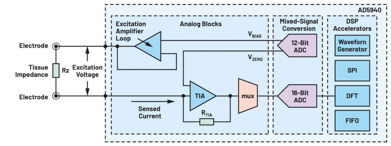 Der AD5940 ist ein präzises und energieeffizientes AFE, das speziell für tragbare EIS-Anwendungen entwickelt wurde. Es besteht aus zwei Erregungsschleifen und einem gemeinsamen Messkanal. Jede Schleife verfügt über 12-bit-DACs zur Erzeugung von Erregungssignalen, eines von DC bis 200 Hz und das zweite bis 200 kHz. Jeder DAC hat einen Erregungspuffer mit Dualausgang, der den nichtinvertierenden Eingang des zugehörigen Potentiostats und den nichtinvertierenden Eingang des Transimpedanzverstärkers (TIA) steuert, der den Strom durch Umwandlung des Stromflusses in eine Spannung misst.