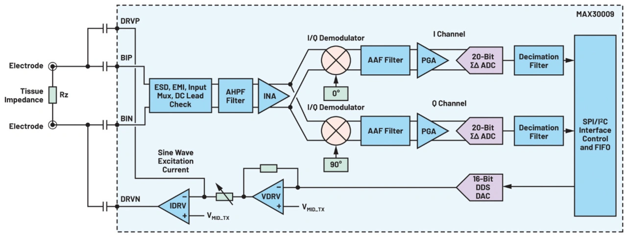 Der Empfangskanal misst die entsprechende Spannung mit hoher Genauigkeit dank der hohen Eingangsimpedanz, der hohen Gleichtaktunterdrückung (CMRR) und des geringen Rauschens. Während beim AD5940 ein DFT-Hardwarebeschleuniger integriert ist, um die Real- und Imaginärteile der Impedanz aus den digitalen Daten des ADC zu berechnen, verwendet der MAX30009 einen I/Q-Demodulator, um das empfangene Analogsignal in seine I/Q-Komponenten aufzuteilen (phasengleich und quadraturphasig mit dem Stimulussignal), wodurch Widerstands- und Reaktanzmessungen mit einer Genauigkeit von 0,1 % möglich sind. Die beiden resultierenden Signale werden anschließend durch einen Verstärker mit programmierbarer Verstärkung und verschiedene optionale Tief- und Hochpassfilter geleitet und schließlich durch zwei hochauflösende 20-bit-∑Δ-ADCs in digitale Signale umgewandelt. Erweiterte Diagnose- und Kalibrierungsfunktionen ermöglichen es dem Benutzer, die korrekten Kabelanschlüsse zu überprüfen und bieten verschiedene Selbsttests. Durch eine sanfte Einschaltsequenzierung wird verhindert, dass große Transienten in die Elektroden eingespeist werden.