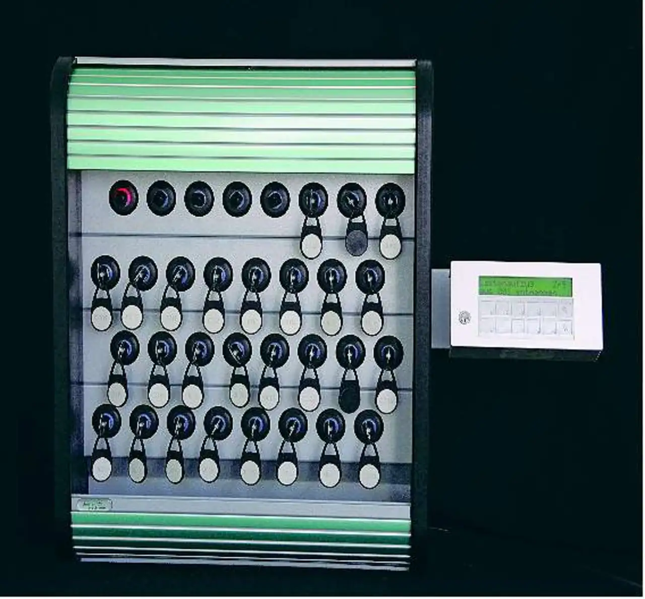 Die Zugangskontrolle lässt sich leicht auf die Absicherung von Medizinschränken ausweiten. Jeder Zugriff wird elektronisch protokolliert - aufwändige manuelle Protokolle entfallen. Die Realisierung erfolgt zum Beispiel über elektronische Schlüsseltresore, in denen die mechanischen Schlüssel aufbewahrt werden. Der Zugriff auf die Schlüssel wird nur für berechtigte Personen freigegeben (Bild 3).