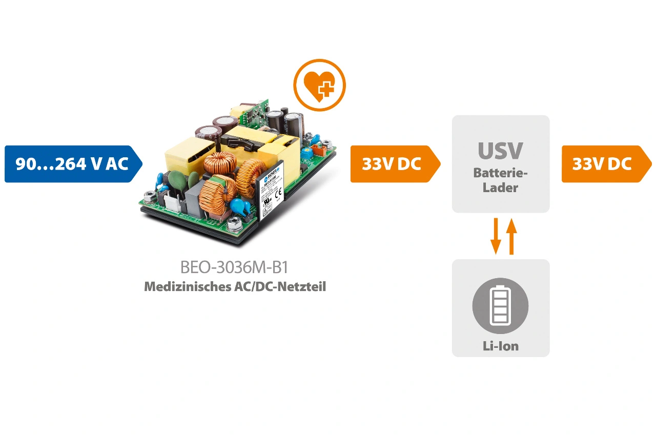 Als Ergebnis der intensiven Zusammenarbeit entstand die Sondervariante Bicker BEO-3036M-B1, ein kompaktes AC/DC-Schaltnetzteil mit exakt geregeltem 33V DC-Ausgang und medizinischer Zulassung für die lüfterlose Energieversorgungseinheit. Das BEO-3036M-B1 zeichnet sich durch hohe Qualität und Langlebigkeit aus, was sich sowohl in der Serie als auch bei den vorangegangenen Temperaturmessungen und Lifetime-Berechnungen bestätigte. Das hocheffiziente Netzteil erfüllt auch die Anforderungen an die elektromagnetische Verträglichkeit, ohne zusätzliche Filter zu benötigen.