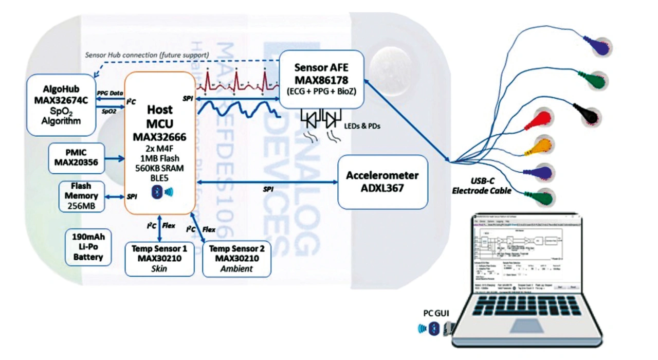 Das Referenzdesign MAXREFDES106 (Bild 3) ist eine umfassende Entwicklungsplattform für Brustgurtdesigns auf der Basis des IC MAX86178. Es enthält einen MAX32674, einen Algorithmus-Hub mit eingebetteten Algorithmen, die speziell für die Arbeit mit den in medizinischen Wearables verwendeten optischen Sensoren entwickelt wurden, einen MAX20356 Leistungsmanagement-IC und einen stromsparenden, rauscharmen 3-Achsen-Beschleunigungsmesser ADXL367. Ein MAX32666-Mikrocontroller mit Bluetooth-5-Verbindungsfähigkeit rundet die Merkmale der Hardware ab.