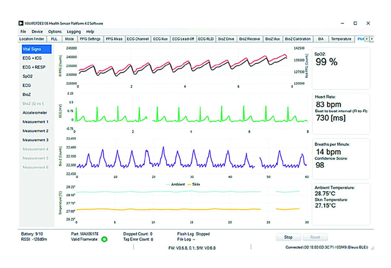 Das MAXREFDES106 ermöglicht die Messung der Sauerstoffsättigung des Blutes (SpO2), der Herzfrequenz (HR), der Atemfrequenz (RR), der Impedanzkardiographie (ICG), der Analyse der Impedanz des Körpers (BIA) sowie der Haut- und Umgebungstemperaturen über ein einziges am Körper getragenes Medizin-Wearbale. Bild 4 zeigt Beispielgrafiken, die von der Plattform und der mitgelieferten Software erstellt wurden.