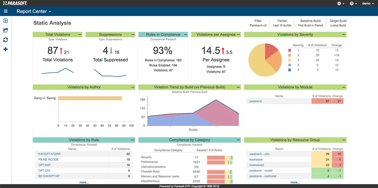 5. Aktivieren weiterer Checker aus der Liste während des Entwicklungsprozesses und der Bereinigung des Quellcodes. Schließlich möchte man nachweisen können, dass man sich an alle ausgewählten Richtlinien gehalten hat und nicht auf halbem Wege stehen geblieben ist. Um den Überblick über den Prozess zu behalten und den aktuellen Fortschritt zu verstehen, ist ein zentrales Berichtssystem hilfreich, das die Testdaten zusammenfasst und die Arbeit der Entwickler überwacht. Ein Beispiel ist unten dargestellt: