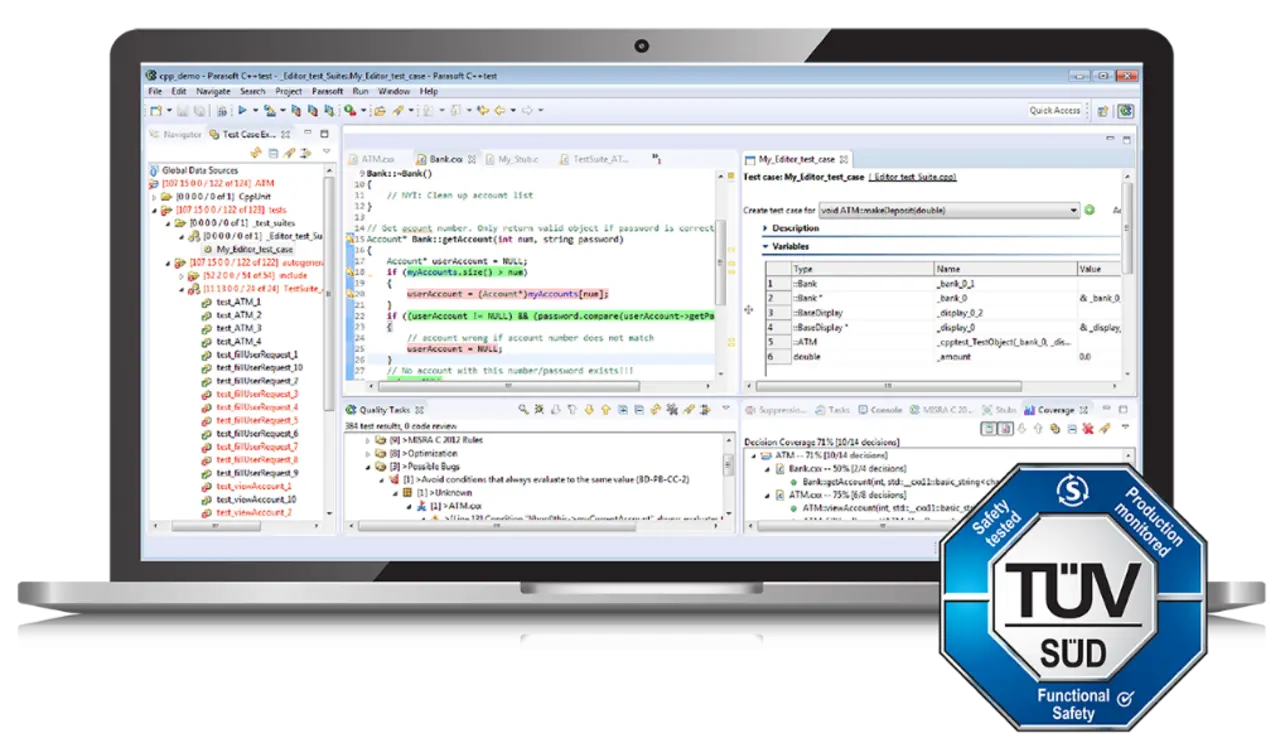 Am besten ist es, wenn der Tool-Anbieter diesen Prozess unterstützt und ein spezielles Tool-Qualifizierungs-Kit zur Verfügung stellt, das gut konzipierte Testfälle und das Automatisierungs-Framework enthält, um diese in der Entwicklungsumgebung des Projekts auszuführen und automatisch die Dokumentation zu erstellen, die als Nachweis für die Tool-Validierung dienen kann. Auch hier bietet Parasofts Vorzeigeprodukt C/C++test ein automatisiertes Tool-Qualifizierungs-Kit.