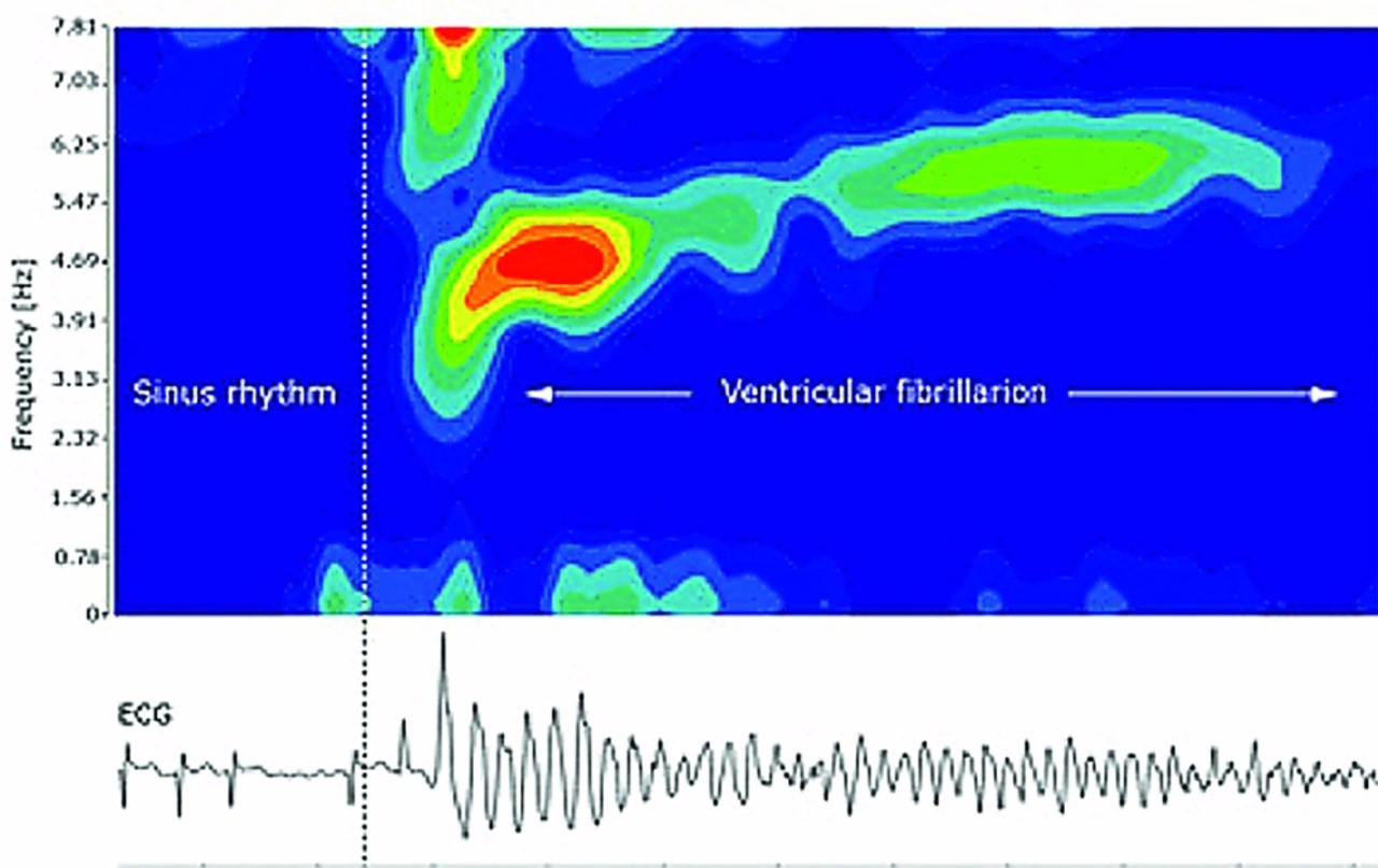 Zum Schluss wird auf Kammerflimmern oder -flattern getestet. Die Erkennung von Kammerflimmern stützt sich nicht auf QRS-Erkennungsergebnisse, da bei Kammerflimmern keine QRS-Komplexe vorhanden sind. Stattdessen führt die Rechenvorschrift mithilfe der Signal Processing Toolbox eine Kurzzeit-Fourier-Transformation mit einem sich bewegenden Fenster durch. Dabei wird auf Frequenzspitzen oberhalb 2 Hz geprüft, die ein Anzeichen für Kammerflimmern oder -flattern sind (Bild 4).