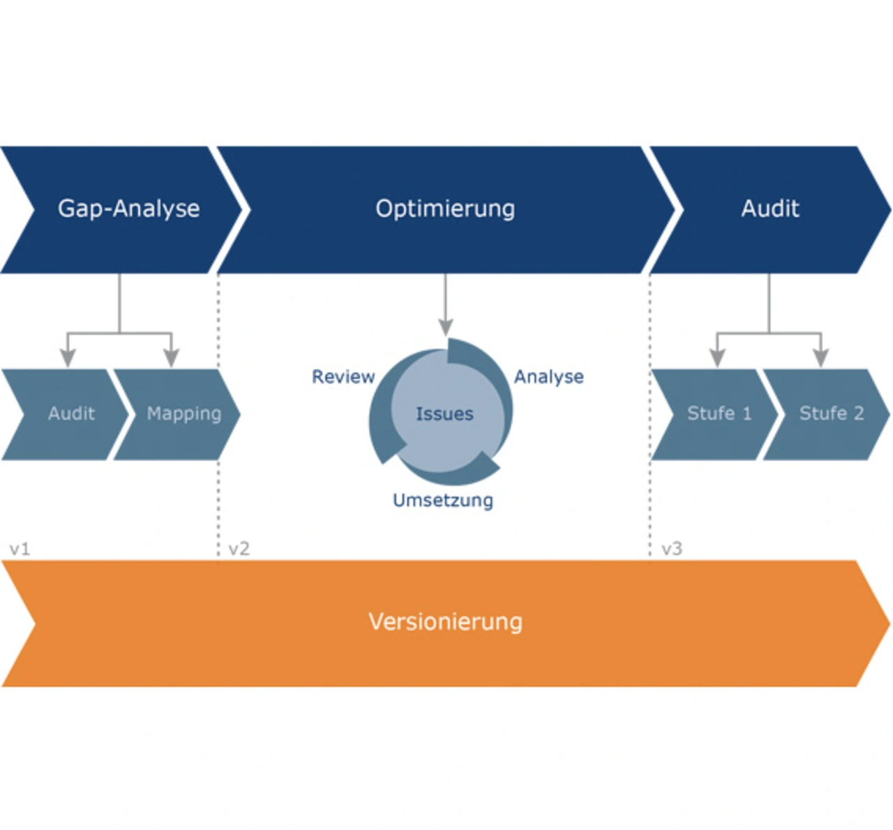 Prozessmanagement-Tools wie Stages ermöglichen ein Mapping zwischen einem hinterlegten Prozessmodell und einem tatsächlich umgesetzten Prozess. Dadurch wird sehr schnell deutlich, in welchen Teilen der Prozess zu verbessern ist beziehungsweise inwieweit er die vorliegende Norm erfüllt. Dieses Mapping sollte in Kombination mit den Ergebnissen der Gap-Analyse als Leitfaden dienen und zeigen, an welchen Stellen des Prozesses gearbeitet werden musste.