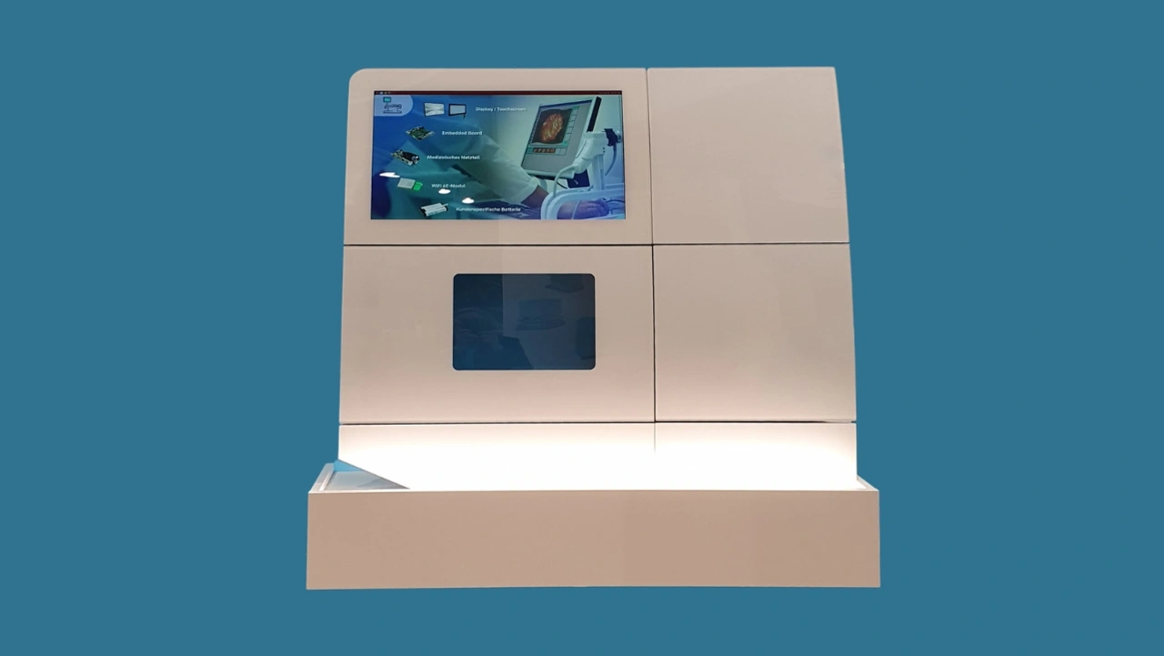 Auf dem Display wird das Interface für den Bediener dargestellt. Der Rechner dient nur zur Visualisierung, nicht zur Ansteuerung der Maschine. Dafür reicht ein schlankes Betriebssystem mit Grafik-Bibliothek aus, das die Eingaben über den Touchscreen entgegennimmt und die Visualisierung auf dem Display ausgibt. Durch die beschränkte Bauhöhe wird auf ein effizientes ARM-System zurückgegriffen, das ohne große Kühlmaßnahmen auskommt. Auf der Basis eines SOM (System On Module) von Kontron wurde ein eigenes Base-Board entwickelt. Dieses Konzept bietet nicht nur alle geforderten Interfaces, sondern auch die Designhoheit und damit den Einfluss auf die Produktlebensdauer für das Medizinprodukt. Das eigene Design ermöglicht auch die optimale Ausnutzung des hinter dem Display zur Verfügung stehenden Bauraums.