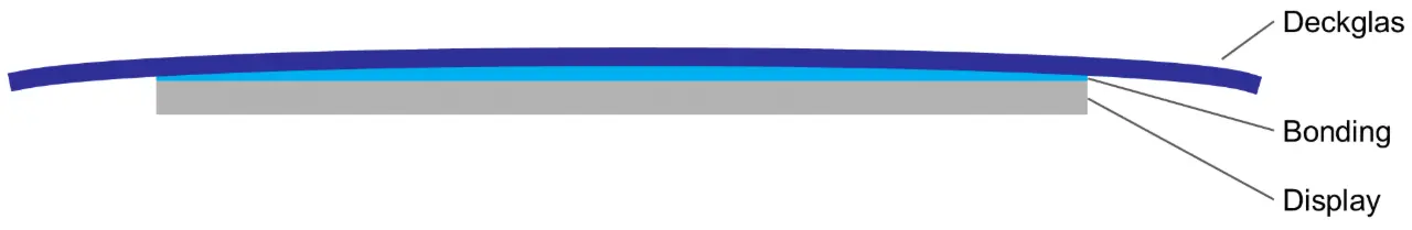 Obwohl das Verkleben eines planen Displays recht konventionell erscheint, ergeben sich Fragen nach der Zuverlässigkeit des Systems. Das Display muss auch unter schrägen Betrachtungswinkeln ohne Verfälschung der Abbildungsqualität ablesbar und trotz Parallaxe bedienbar sein. Dazu wird das Material für das Optical Bonding des Raums zwischen Display und Deckglas mit einem transparenten Material aufgefüllt, das einen passenden Brechungsindex hat und dadurch die Reflexionen minimiert. Außer den optischen Eigenschaften muss es zudem so ausgewählt werden, dass es auch bei unterschiedlicher Schichtdicke (am Rand nahe Null, in der größten Wölbung über einen Zentimeter) aushärtet und für mechanische Stabilität sorgt. Ein eigens konstruierter Montagerahmen, der in Spritzgusstechnik gefertigt wird, hält nicht nur den gesamten Aufbau mit Deckglas und Display an der korrekten Stelle, sondern sorgt durch seine Steifigkeit auch für eine gleichmäßige Verteilung der Kräfte, um eine Delamination zu vermeiden.