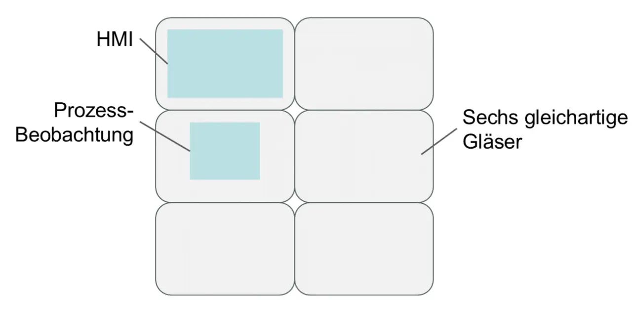 Die Front des gesamten Geräts besteht aus fünf weiteren Gläsern, die identisch bedruckt sind, aber abgesehen von einem Fenster zum Arbeitsraum keine weiteren Funktionen haben. Das optische Erscheinungsbild muss auch ohne dahinter gebondeten Touchsensor und Display identisch sein.