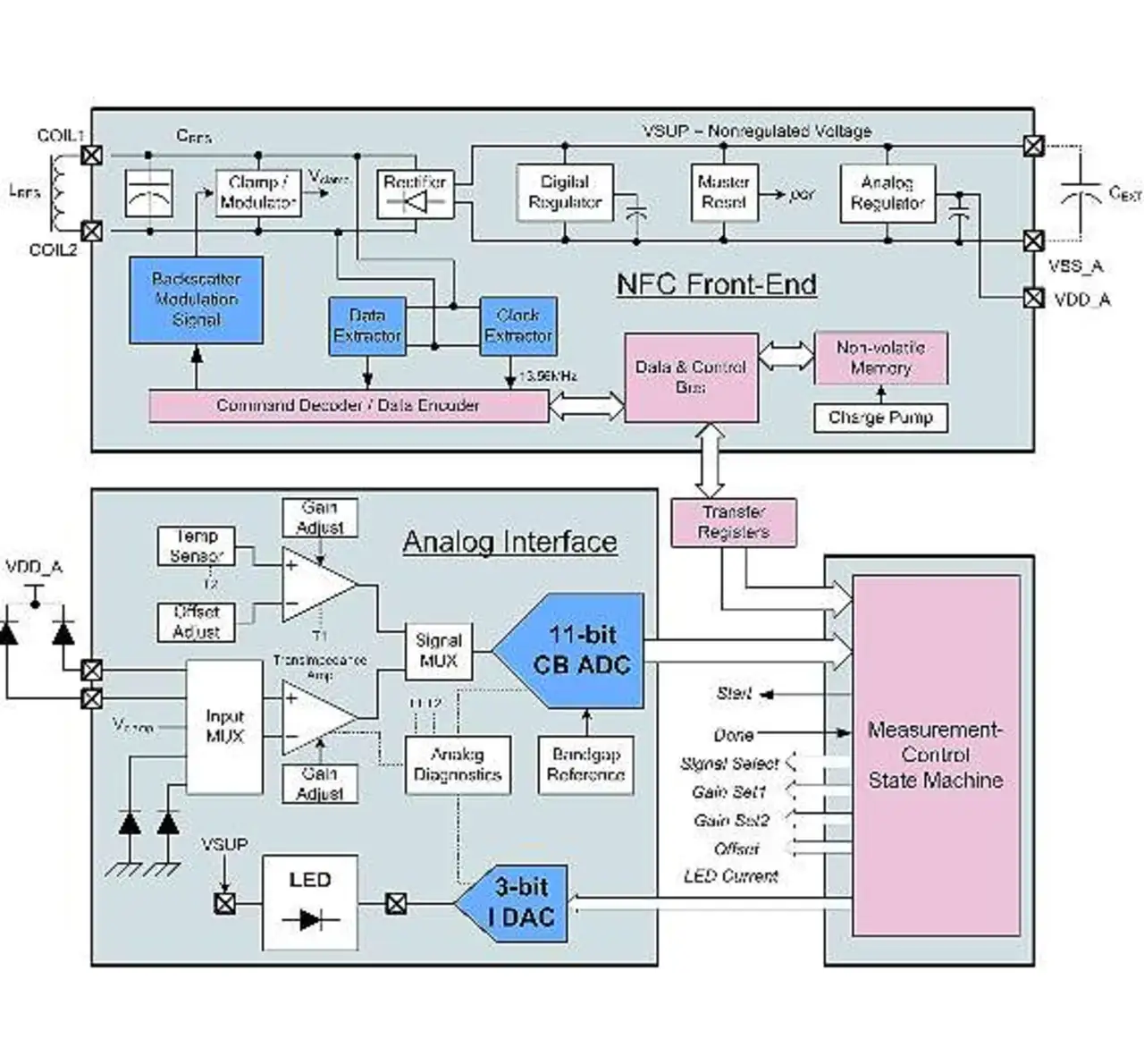 Teil des Analog-Interface ist der LED-Treiber, der von einem 3-Bit-D/A-Wandler angesteuert wird. Dieser D/A-Wandler kann die LED weich einschalten und verhindert so abrupte Spannungseinbrüche im System. Mit Hilfe eines 11-Bit-A/D-Wandlers kann der Baustein einen »On-Chip«-Temperatursensor, die zwei »On-Chip«-Fotodioden, als auch zwei »Off-Chip«-Fotodioden sowie die aktuelle »Feldstärke« des extern angelegten Magnetfelds messen. Diese Daten werden dann mittels der »Control State-Machine« an das RFID-Frontend übergeben und drahtlos zu einem externen Reader übertragen.