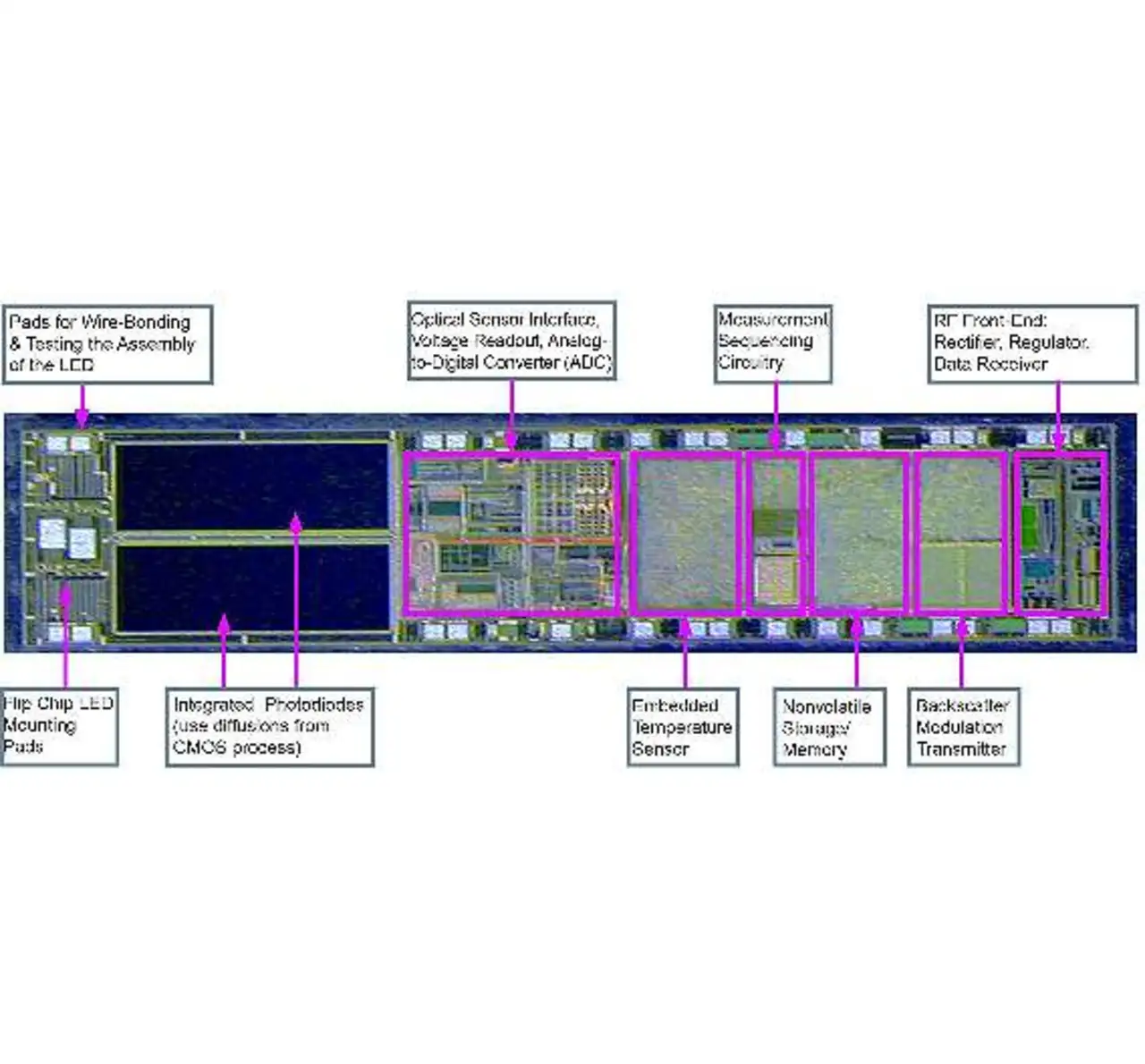 Aufgrund der Erfahrung von ZMDI auf dem Gebiet der Low-Power-/Low-Voltage-Entwicklung war bereits die erste Version des ICs voll funktionsfähig und kann für die klinischen Studien eingesetzt werden. Bild 2 zeigt den Chip und kennzeichnet die verschiedenen Funktionsblöcke. Das ASIC wird als zentrale Funktionseinheit in dem implantierbaren kontinuierlichen Glukosesensor verwendet.