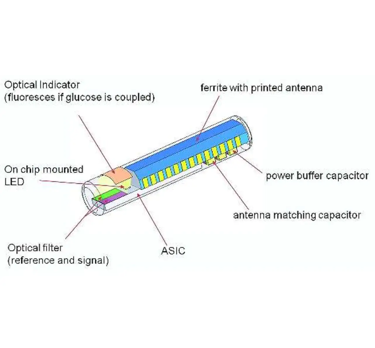In Hörgeräten erprobte Halbleitertechnologie bildet die Basis für ein ASIC, mit dem sich in einem implantierbaren Sensor der Blutzuckergehalt von Diabetes-Patienten kontinuierlich bestimmen lässt. Ein halbes Jahr kann dieser Sensor im Körper bleiben, dann ist das biochemische fluoreszierende Sensormaterial verbraucht. Momentan läuft die klinische Erprobung des Systems.