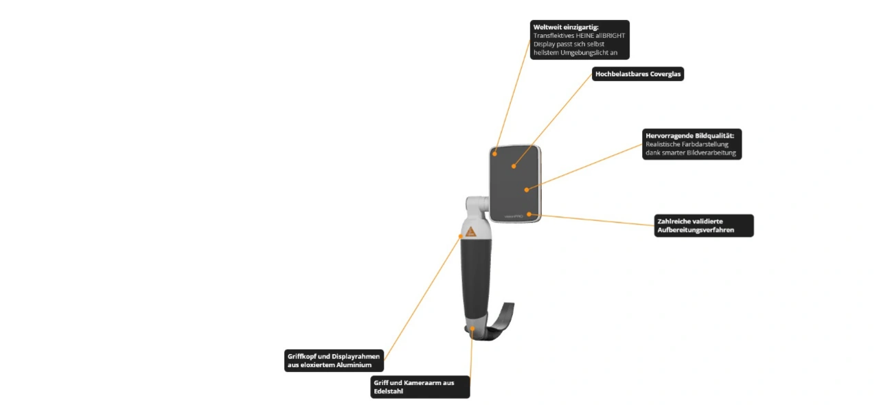 Für eine schnelle und zielsichere Intubation ist nichts wichtiger als die beste Sicht auf die Anatomie der Stimmbandebene. Mit dem transflektiven allBRIGHT Display von Heine zeigt sich eine helle und scharfe Abbildung, sogar bei sehr hellem Umgebungslicht. Farben erscheinen naturgetreu. Dank Hochformat bietet sich dem Intubierenden eine extragroßes Sichtfeld, das einen umfangreichen Ausschnitt der relevanten Anatomie erfassen kann.