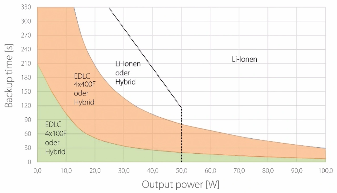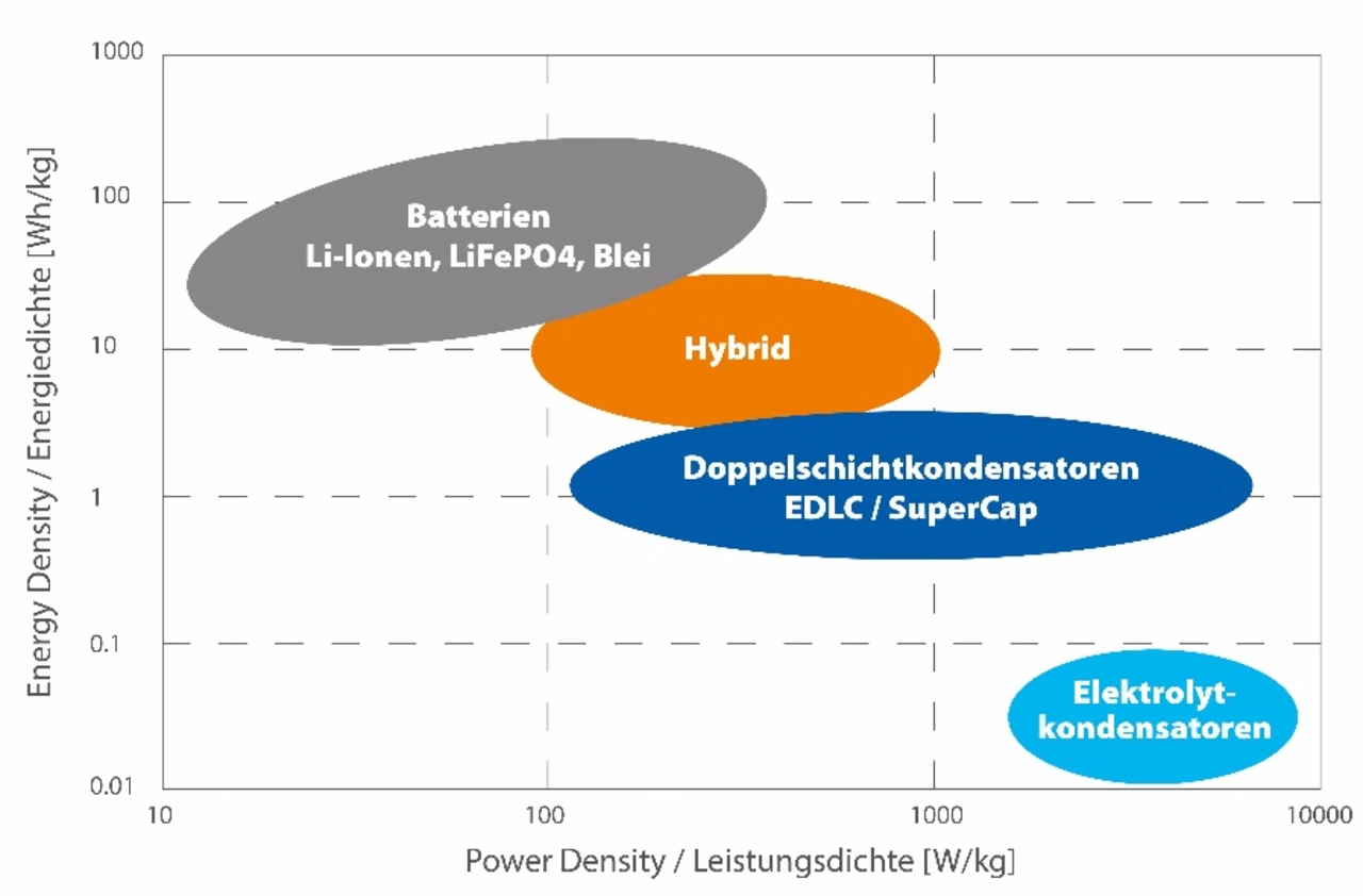 Obgleich die schnellen SuperCaps wie dargestellt beeindruckende Eigenschaften und Einsatzmöglichkeiten für die unterbrechungsfreie Stromversorgung bieten, gilt es bei der Gesamtkonzeption eines Systems immer nach wirtschaftlichen und technologischen Aspekten das optimale Energiespeicher-System auszuwählen. Hierbei ist zunächst der Unterschied zwischen Energiedichte (in Wh/kg) und Leistungsdichte (in W/kg) von Bedeutung (Bild 4). Werden große Energiedichten und lange Überbrückungszeiten benötigt, lässt sich dies mit Doppelschicht-Kondensatoren unter Umständen nicht mehr wirtschaftlich sinnvoll lösen (großes Batteriepack-Volumen, hohe Kosten etc.).