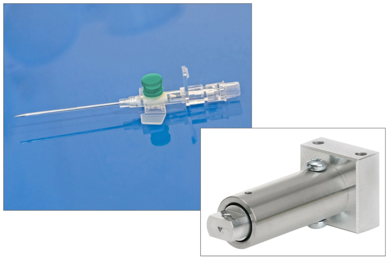 Bei der End-of-Line-Prüfung von Stahleinstechnadeln wird geprüft, wie leichtgängig diese sich in einen flexiblen Kanülen-Katheter bewegt. Dazu muss die Reibkraft gemessen werden. Hier kommt ein System zur Einpress- und Fügeüberwachung zum Einsatz (DIGIFORCE® 9307), das die Kraft-/Weg-Verläufe von zwei Prüflingen gleichzeitig überwacht und auswertet. Ein Greifer setzt dazu an den beiden Kanülen an und führt eine gleichförmige Vor-Rückbewegung durch. Die extrem geringen Reibkräfte von weniger als 1N werden über sensible Biegebalken-Kraftsensoren der burster-Serie 8510 erfasst. So lassen sich höchste Qualitätsanforderungen in der Fertigung einhalten (Bild 1).