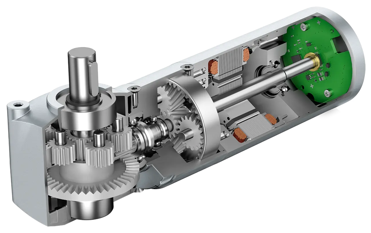 Bei den Kronenradgetrieben EtaCrown und EtaCrownPlus von ebm‑papst baut das evolventische Antriebsritzel zylinderförmig. Der Kontakt zwischen Ritzel und Abtriebsrad ist ein Wälzkontakt und dadurch treten kaum Reibungsverluste auf. Der Wirkungsgrad liegt daher auch bei hohen Untersetzungen im Bereich von 90 %. Die Motorleistung steht so fast vollständig der Antriebsaufgabe zur Verfügung. 10 % Verlustleistung gegenüber bis zu 75 % bei herkömmlichen Schneckenradausführungen (abhängig von der gewählten Untersetzung) sind auch bei kleinen Antrieben ein enormes Sparpotential. Oft kann man den Antriebsmotor zudem kleiner dimensionieren und Bauraum sowie Kosten sparen.