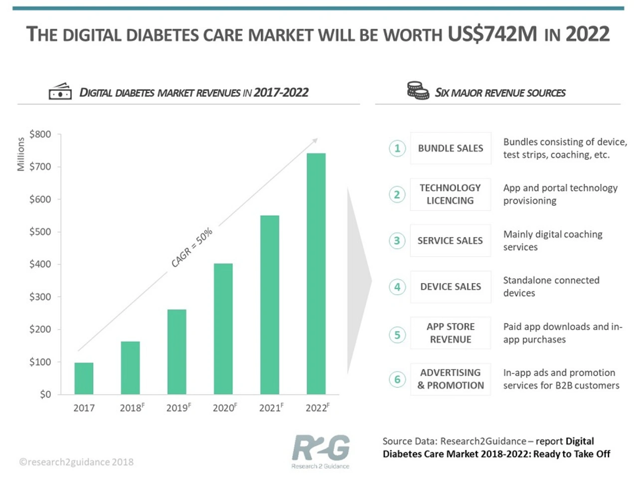 Diese Expansion führte zu einem deutlichem Wachstum: Der Umsatz im digitalen Diabetes-Markt stieg 2017 um das Dreifache auf 98 Millionen US-Dollar. Auf der anderen Seite wurden neue Einnahmequellen für digitale Publisher geschaffen, welche es ermöglichen, außerhalb von App Stores Geld zu verdienen. Im Markt für digitale Diabetes-Lösungen gibt es sechs wichtige Einnahmequellen: