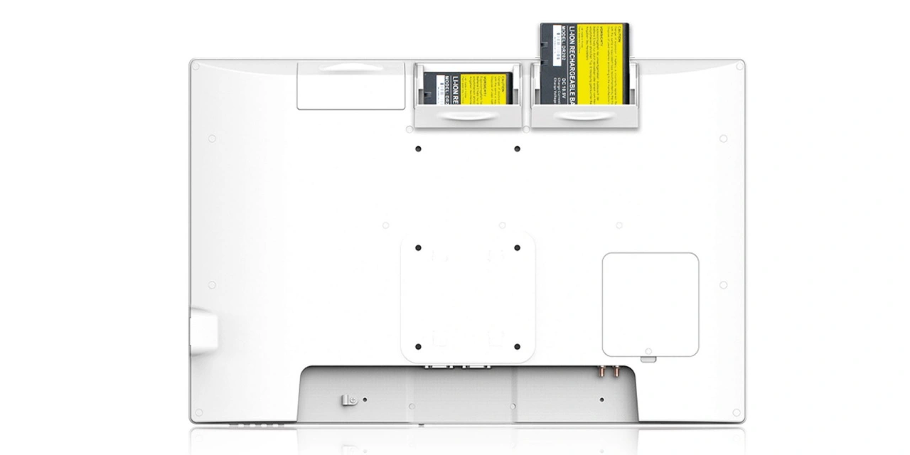 In Einschubfächern an der Geräterückseite befinden sich drei im laufenden Betrieb wechselbare, leistungsstarke Akkus, die den Monitor mit Energie versorgen und darüber hinaus auch Drittgeräte wie Thin Clients, Label-Drucker oder Barcode-Scanner mit Strom speisen können. Das antimikrobielle und abwischbare Chassis macht die DT72x-Serie zum perfekten Begleiter auf Visitenwagen – insbesondere dort, wo alte, aber noch fitte Visitenwagen modernisiert beziehungsweise elektrifiziert werden sollen.