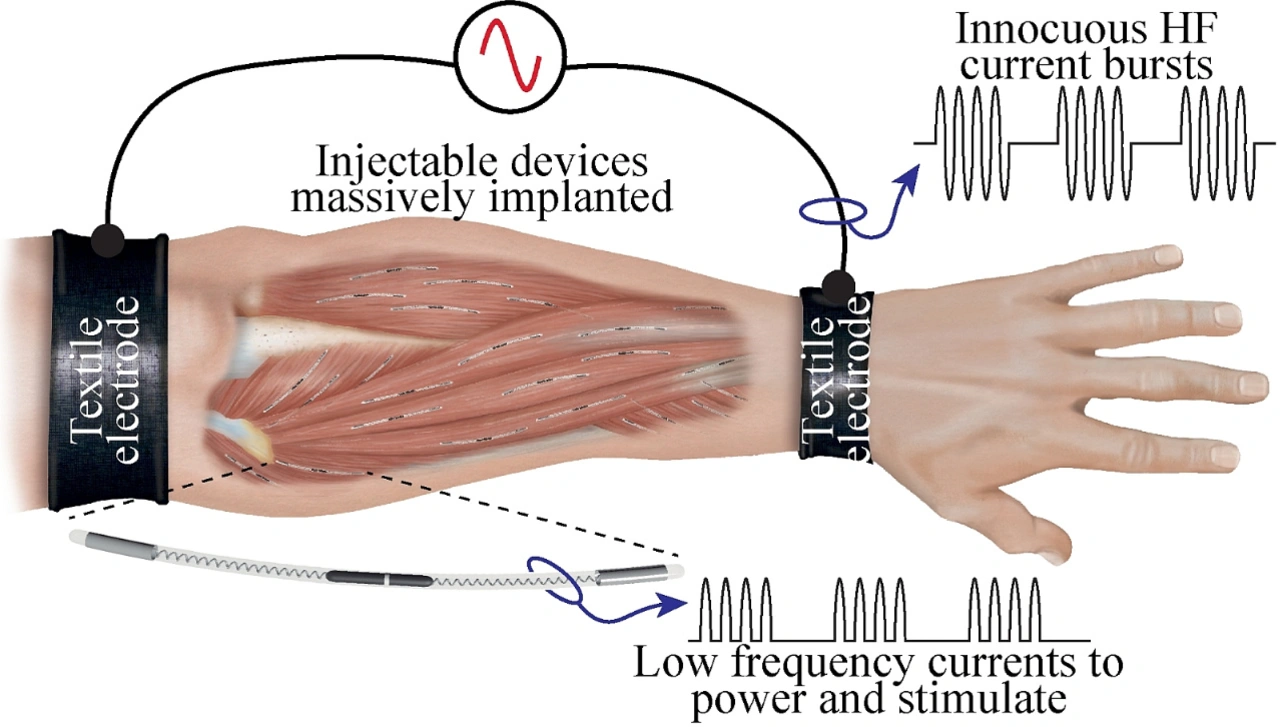 Da Tremor oftmals an beiden Armen und beiden Beinen auftritt, können in allen betroffenen Muskelgruppen Implantate injiziert und externe Textilelektroden platziert werden. So entsteht ein verteiltes Sensorik-Netzwerk. Die Controller haben alle implantierten und alle externen Elektroden gleichzeitig im Blick und können diese abgestimmt aufeinander steuern. Dies alles geschieht in Echtzeit, der Mensch nimmt keine Verzögerung wahr. Die Technologie ist ebenso funktional wie klassische Implantatsysteme, aber nur minimal-invasiv und daher leichter zu akzeptieren und alltagstauglich.